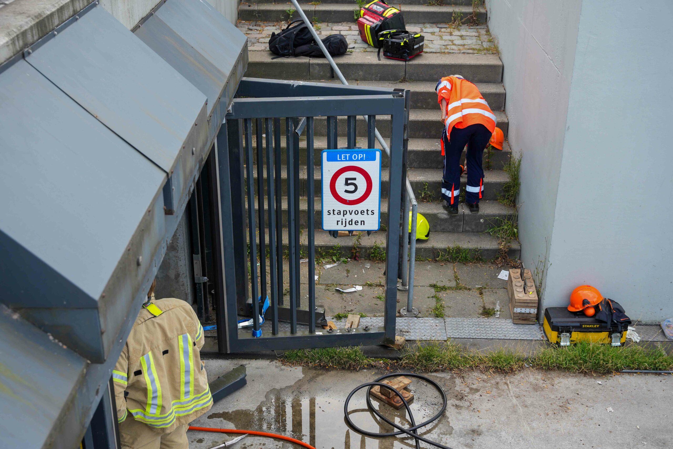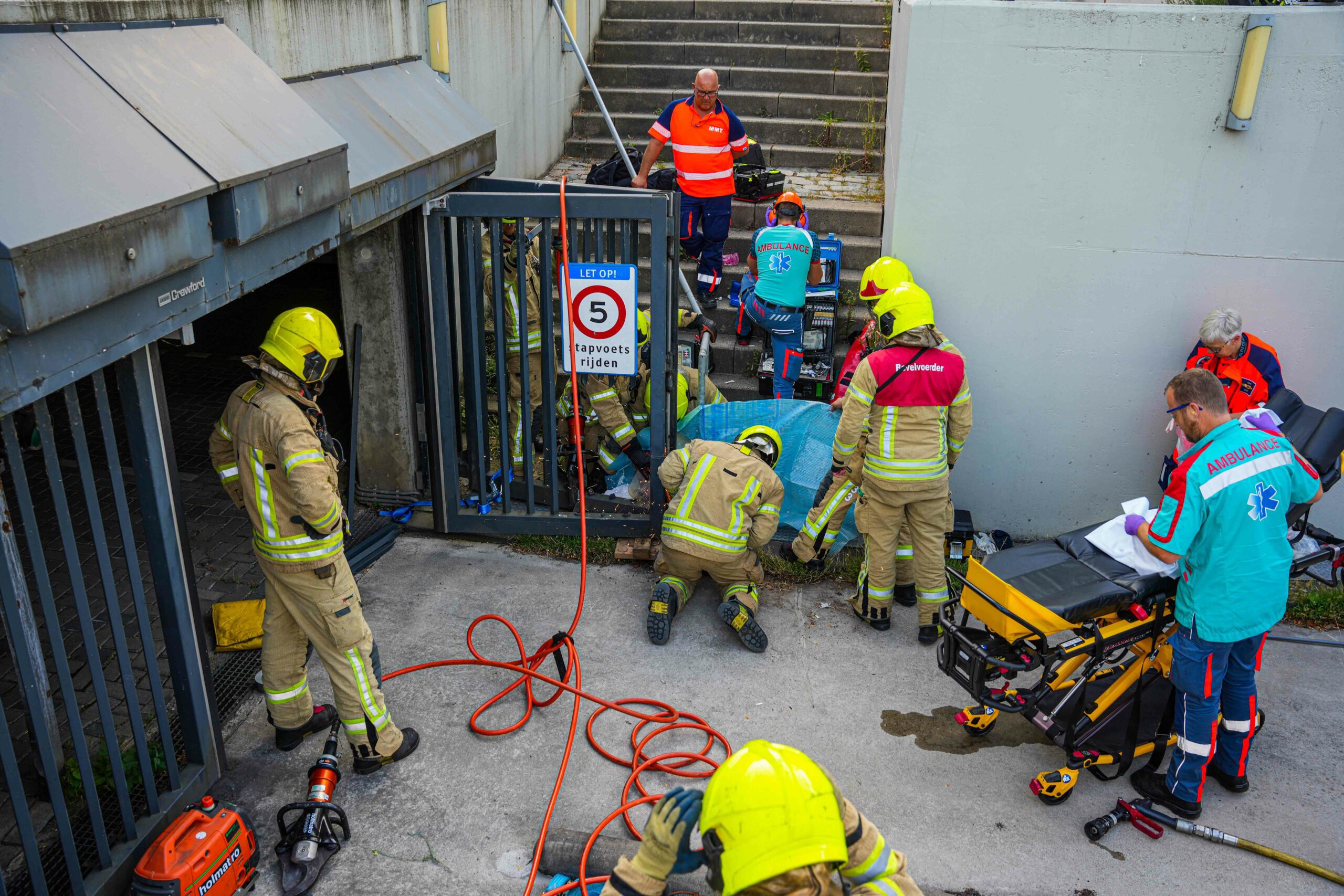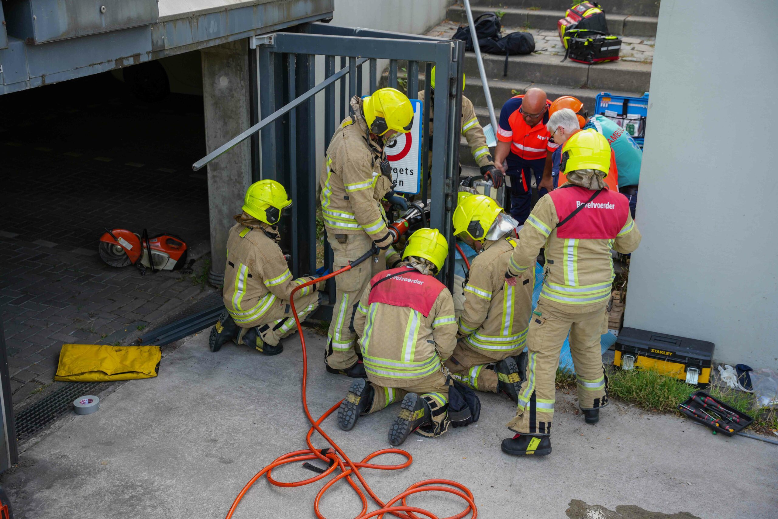 Het jongetje kwam aan het begin van de avond door onbekende oorzaak met zijn been bekneld te zitten onder de garagedeur. Hulpdiensten rukten hierop met groot materiaal uit. Een grote slijper van de brandweer werd ingezet waarna de jongen uit zijn benarde positie kon worden bevrijd.