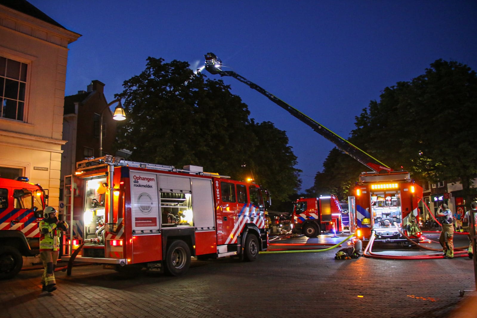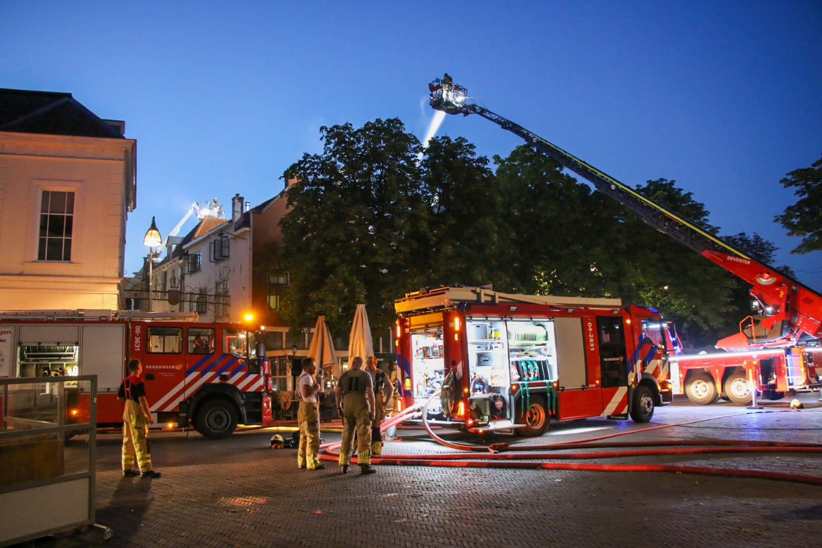 De brand op de Brink wordt geblust met water uit de IJssel. De Wellekade is daarom afgesloten voor verkeer. Veiligheidsregio IJsselland adviseert iedereen in het centrum van Deventer en omgeving om ramen en deuren gesloten te houden en de ventilatie uit te zetten in verband met de rook.
