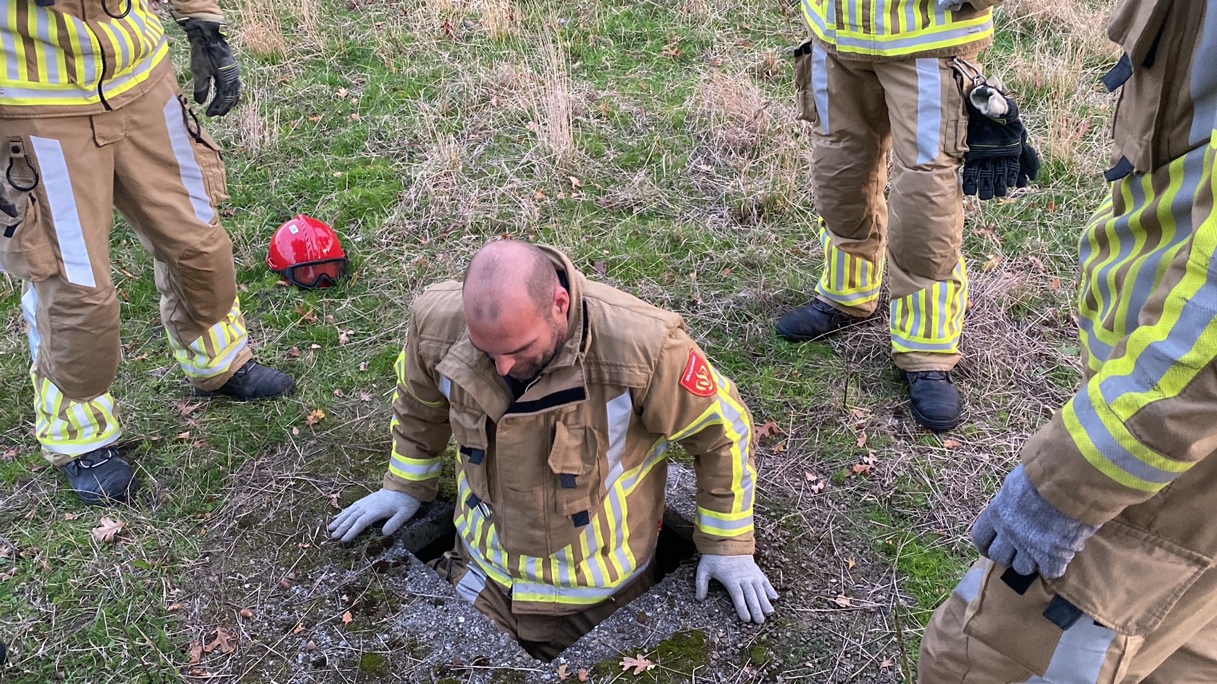 Eén brandweerman liet zich in de put zakken, pakte het diertje en gaf hem over aan collega’s. Het dier leek wat uitgeput naar verder niet gewond. De brandweerlieden droegen het dier verderop naar de tankautospuit alwaar het dier een lift kreeg naar de eigenaar.