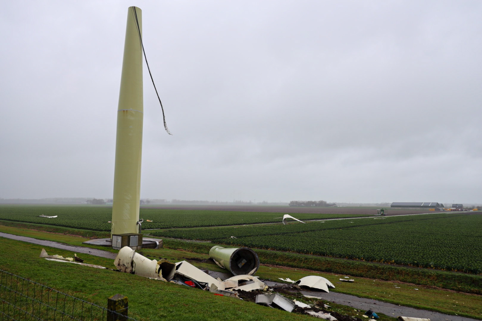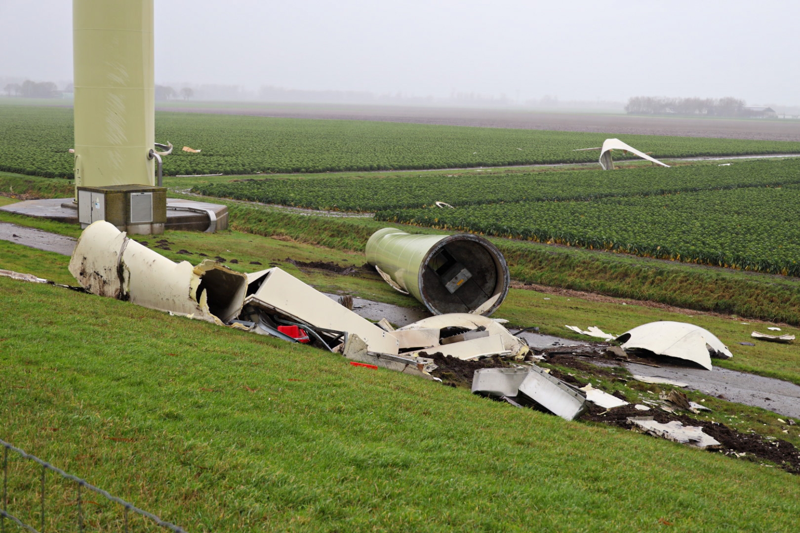 De brokstukken liggen verspreid over enkele honderden meters. De weg is afgesloten voor doorgaand verkeer. De molen staat in een rij met zestien andere windmolens. Vattenfall is eigenaar van het windmolenpark. Die laat weten ook de andere zestien windmolens uit voorzorg zijn stilgezet.