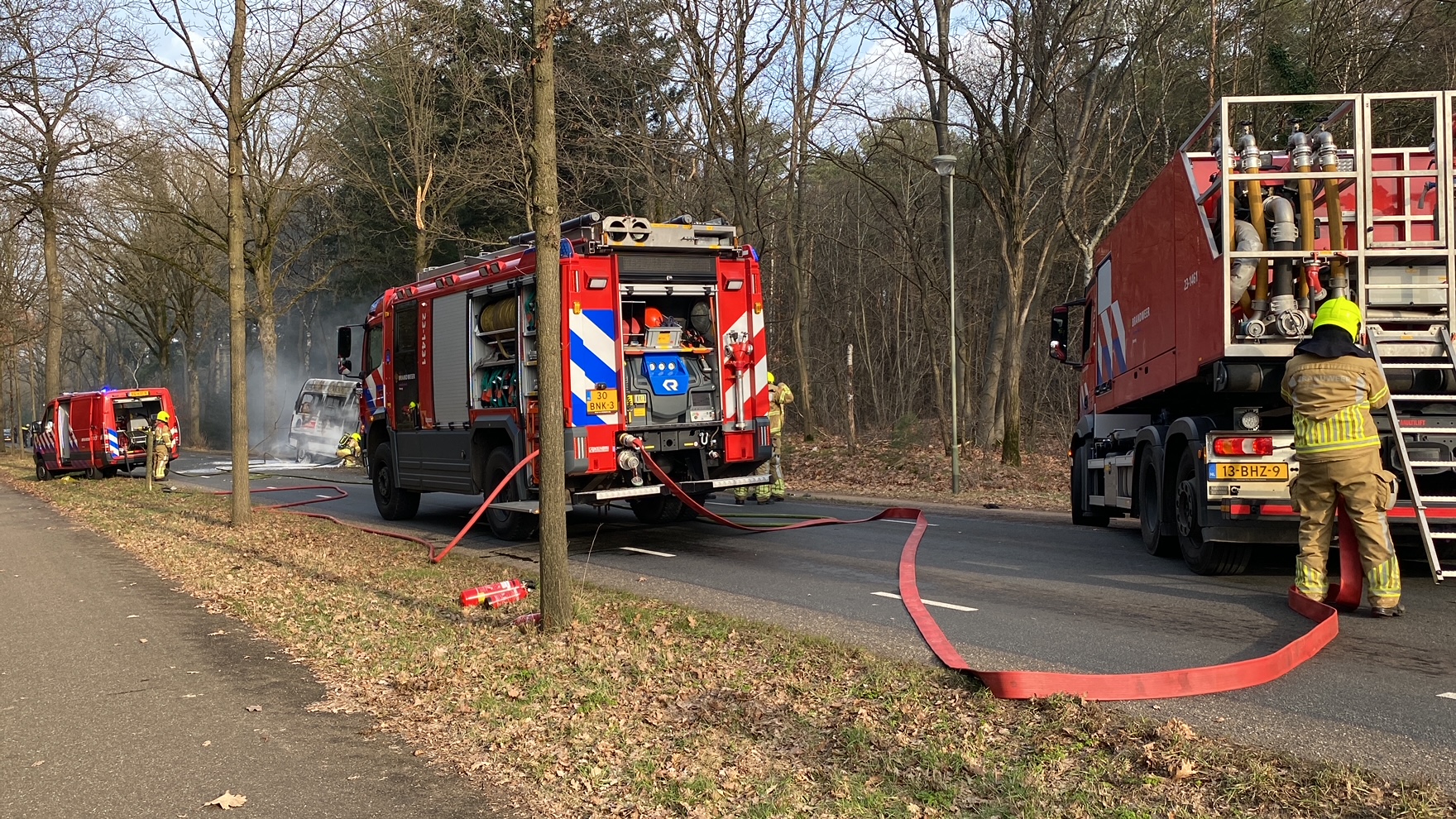 Door nog onbekende oorzaak raakte het busje rond 14.30 uur van de weg en botste tegen een boom. Het voertuig vloog vervolgens in brand.