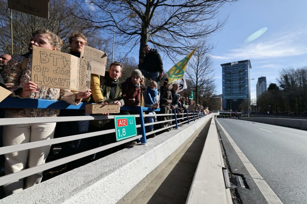 XR protesteert op de snelweg A12 bij Den Haag tegen subsidies voor fossiele brandstoffen. Voor de blokkade was geen toestemming gegeven, maar een paar duizend mensen liepen aan het begin van de middag toch de weg op.