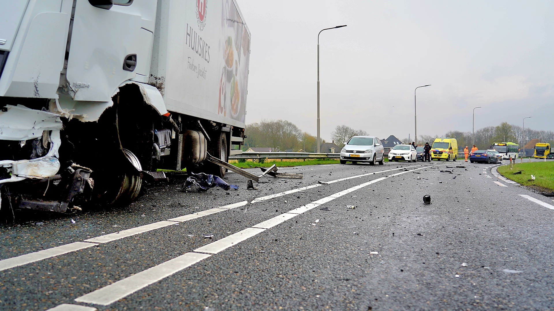 BERGEN – Op vrijdagochtend heeft er een ernstig ongeluk plaatsgevonden op de N9 ter hoogte van Bergen. Een vrachtwagen en een auto zijn op elkaar geklapt, waarbij de bestuurder van de auto gewond is geraakt en naar het ziekenhuis is overgebracht. De weg ligt bezaaid met schade van beide auto’s en de N9 is voor onbekende tijd afgesloten van beide zijden.