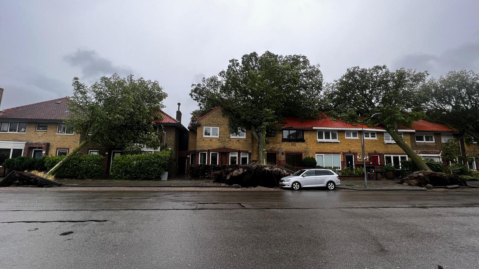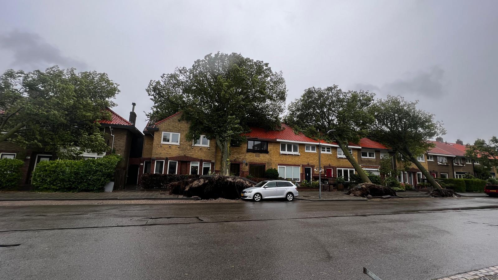 HAARLEM – Op de Molijnstraat in Haarlem zijn woensdagochtend door de storm Poly meerdere grote bomen omgewaaid en tegen een rij woningen gevallen.