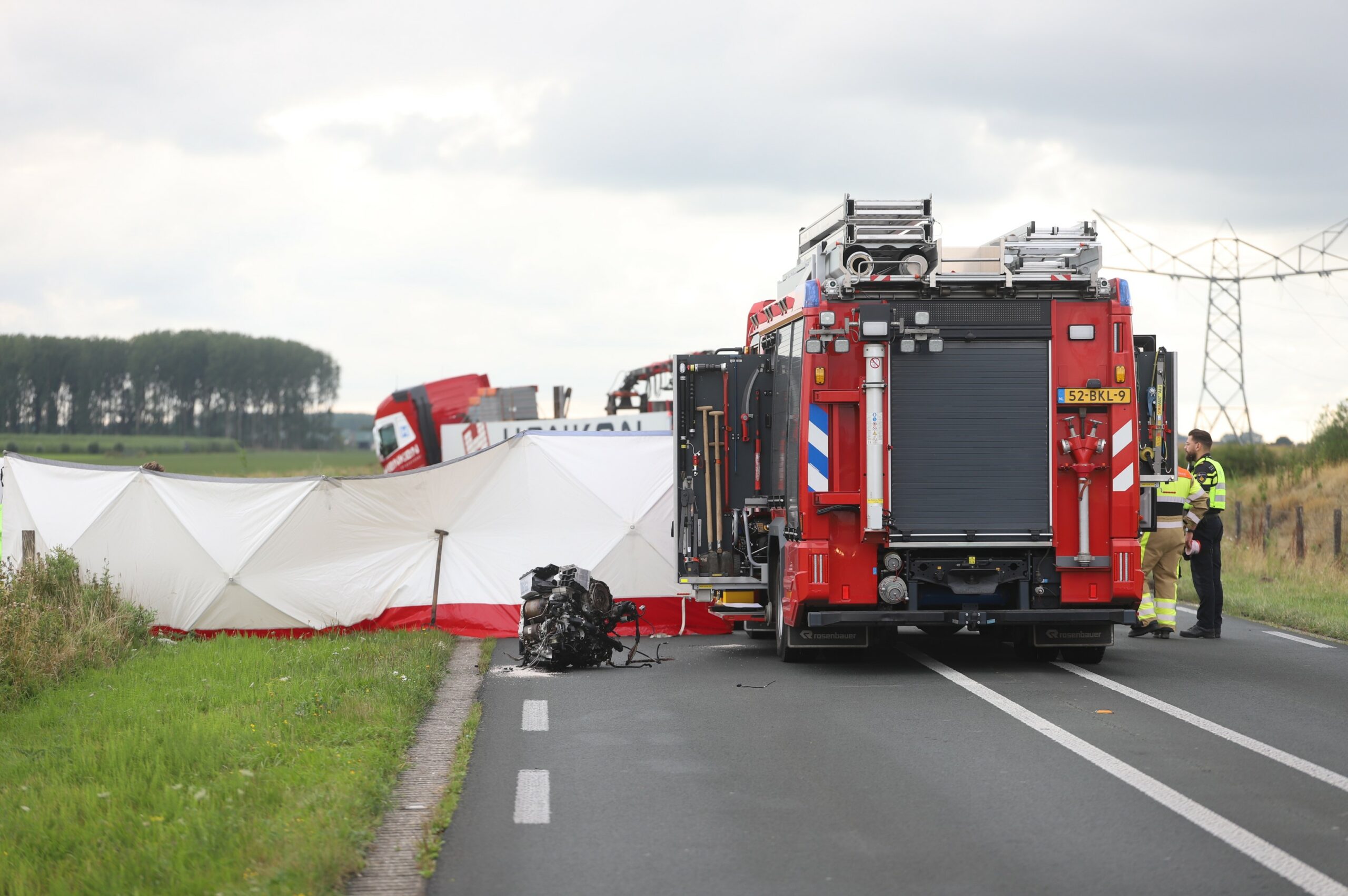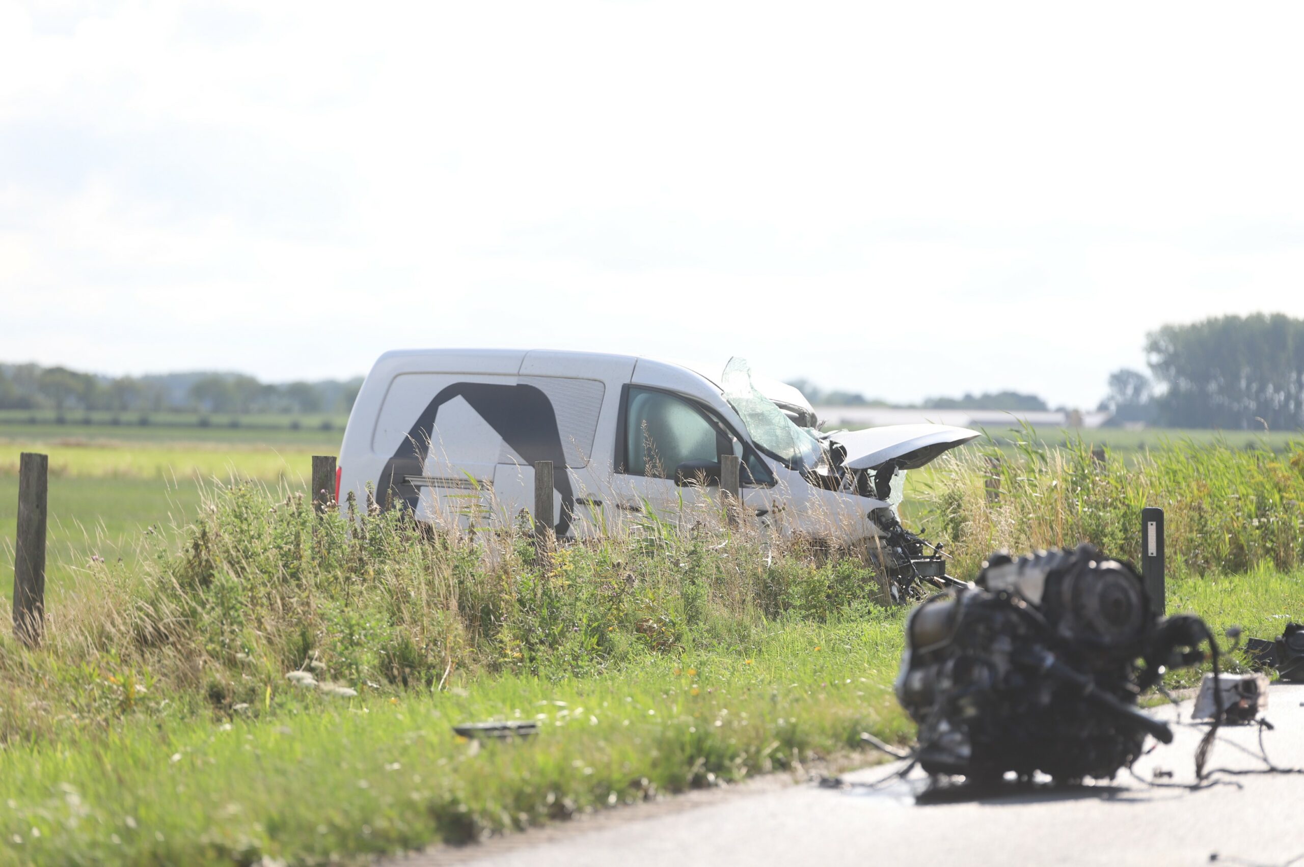 De weg ligt bezaaid met brokstukken, waaronder een losgeslagen motorblok. De politie is een onderzoek gestart naar de oorzaak van de aanrijding.