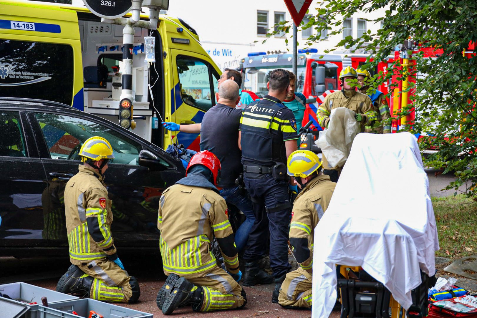 Pijnlijke beknelling: man zit klem tussen auto en paal na aanrijding