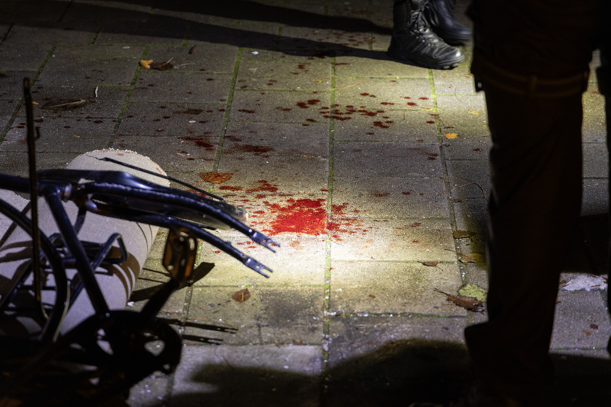 Een gebied is afgezet voor sporenonderzoek. Een raam van een appartement is kapot en op de grond ligt veel bloed. De Forensische Opsporing is opgeroepen om alle sporen veilig te stellen. Voorafgaand aan de steekpartij zou er een ruzie hebben plaatsgevonden.