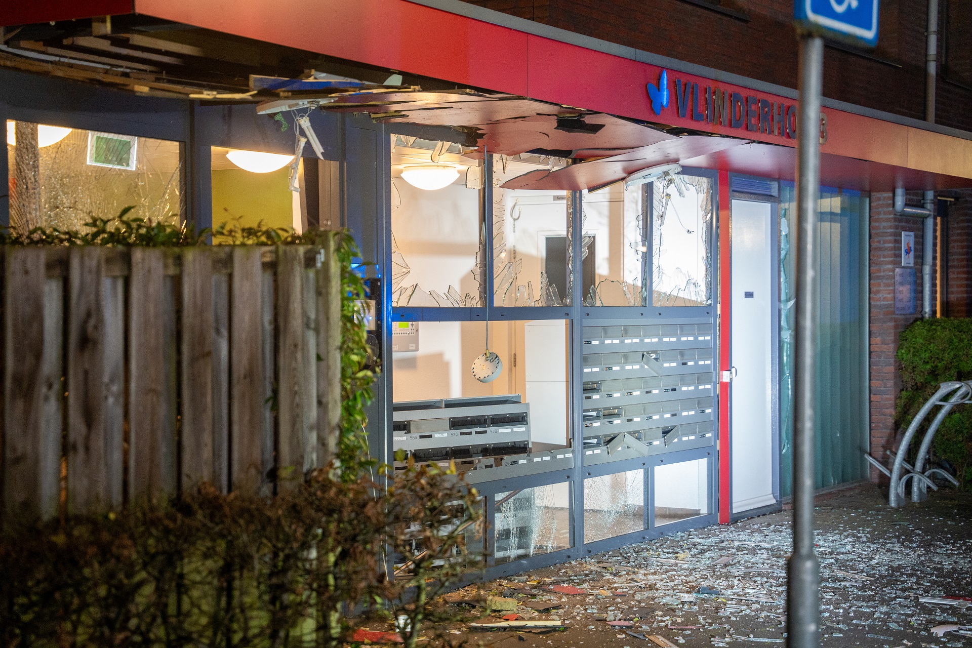 Door de explosie zijn bijna alle ruiten dan de ingang gesprongen.