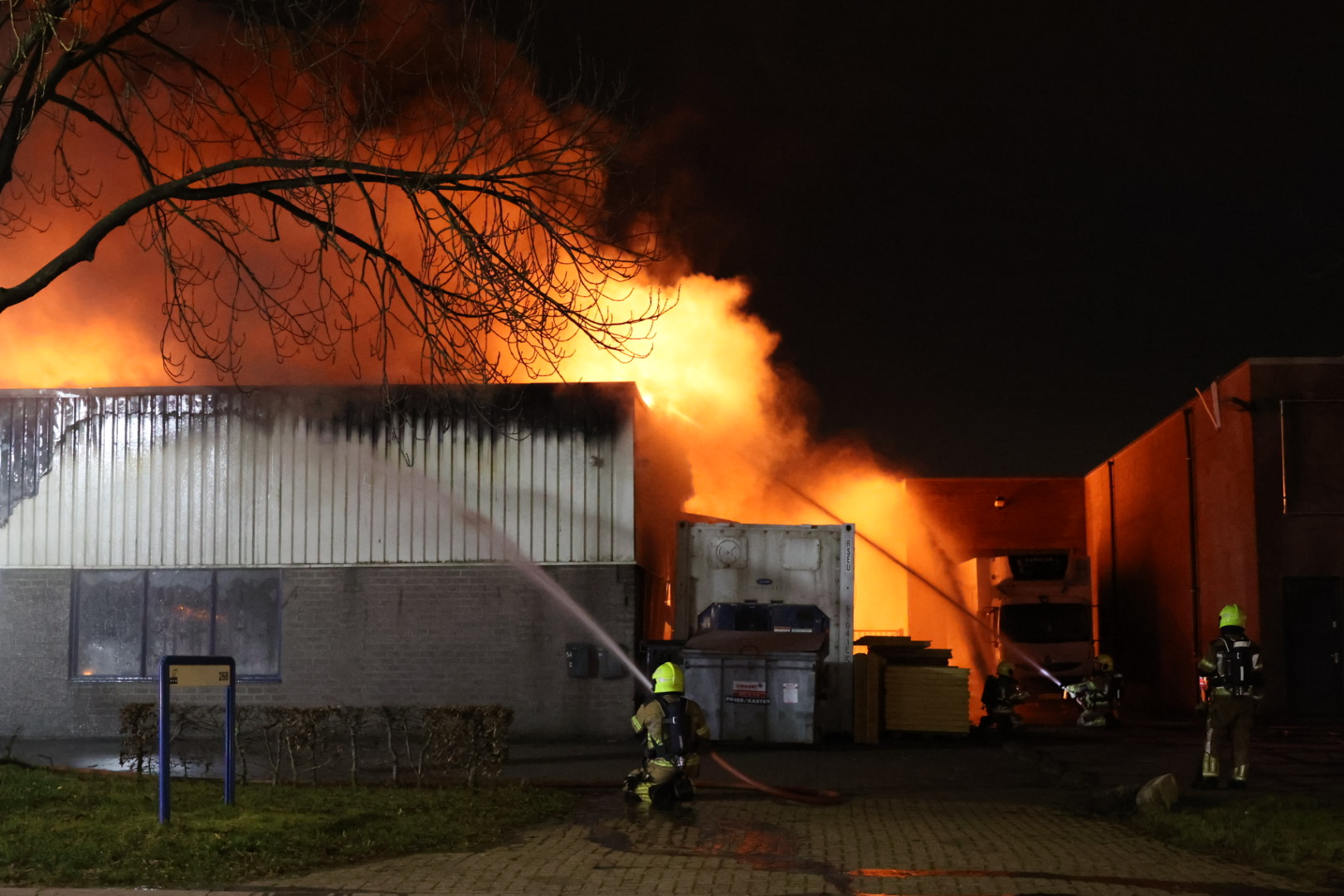 Een bedrijfspand op de locatie staat volledig in brand, en volg is gedeeltelijk al ingestort. De oorzaak van de brand is vooralsnog onbekend.