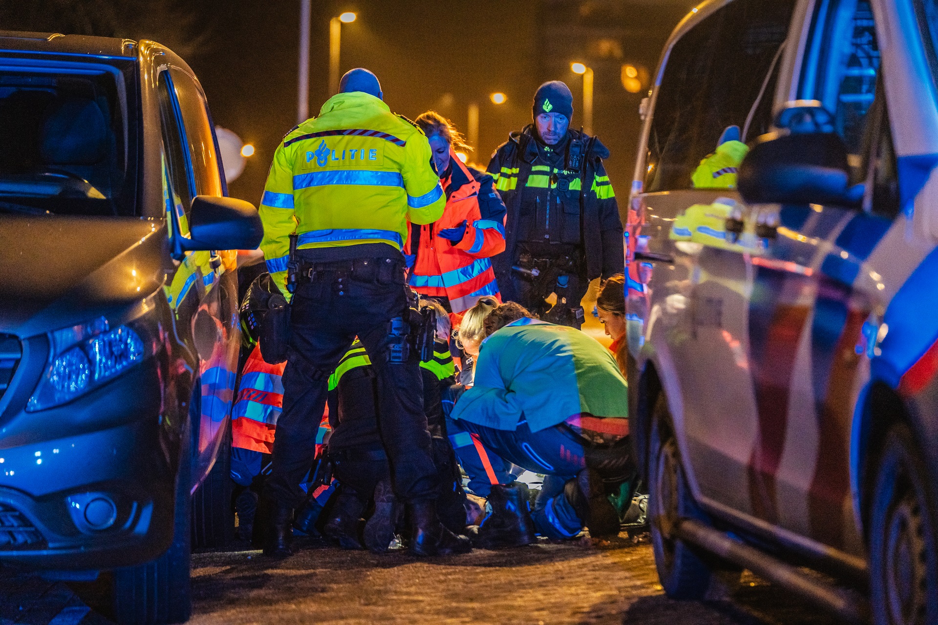 Ambulancepersoneel kreeg ondersteuning van de collega’s van het Mobiel Medisch Team. Zij hebben het slachtoffer een roesje gegeven zodat hij behandeld kon worden. Kort daarna is hij met spoed naar het ziekenhuis overgebracht. Ondertussen was de andere vechtersbaas aangehouden, ook hij flink wat bloed aan zijn handen.