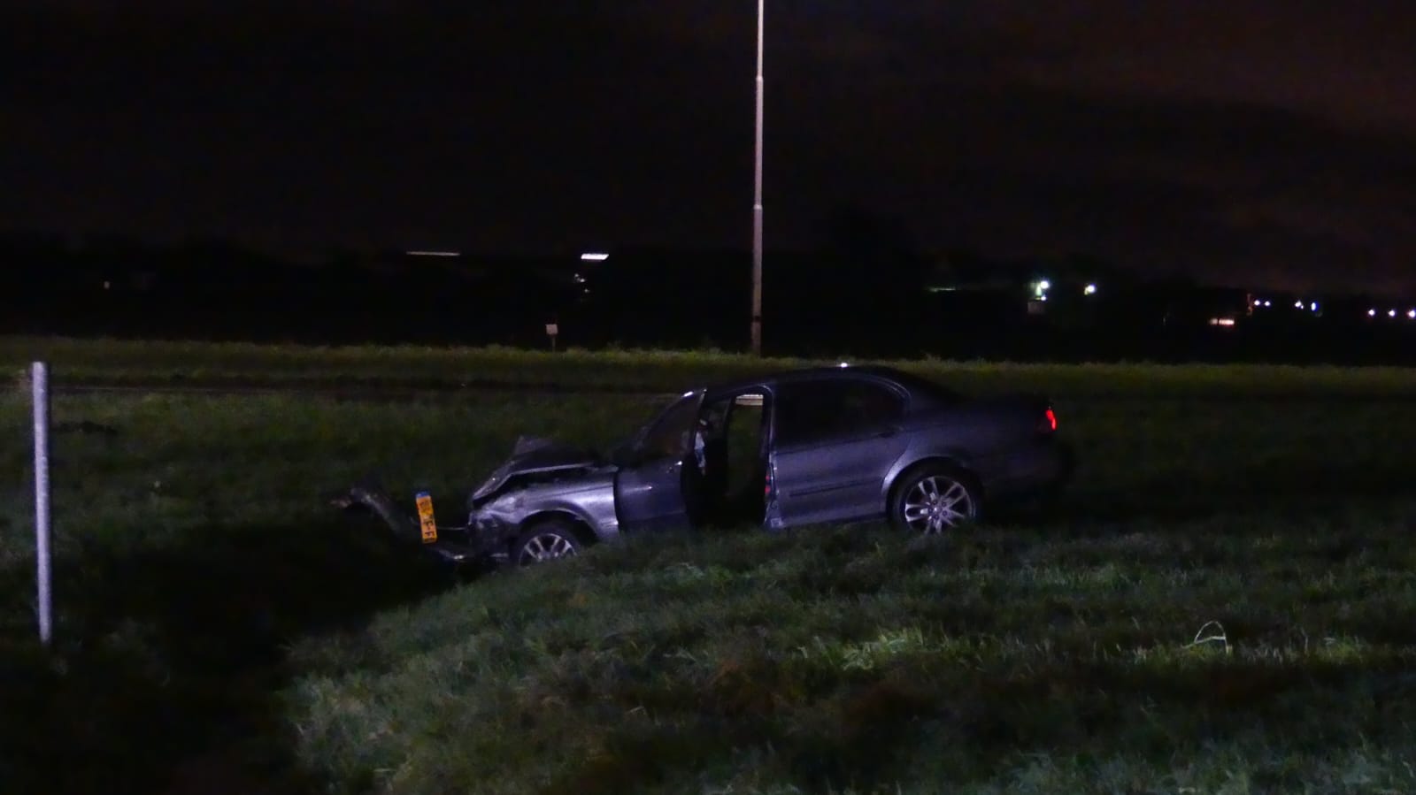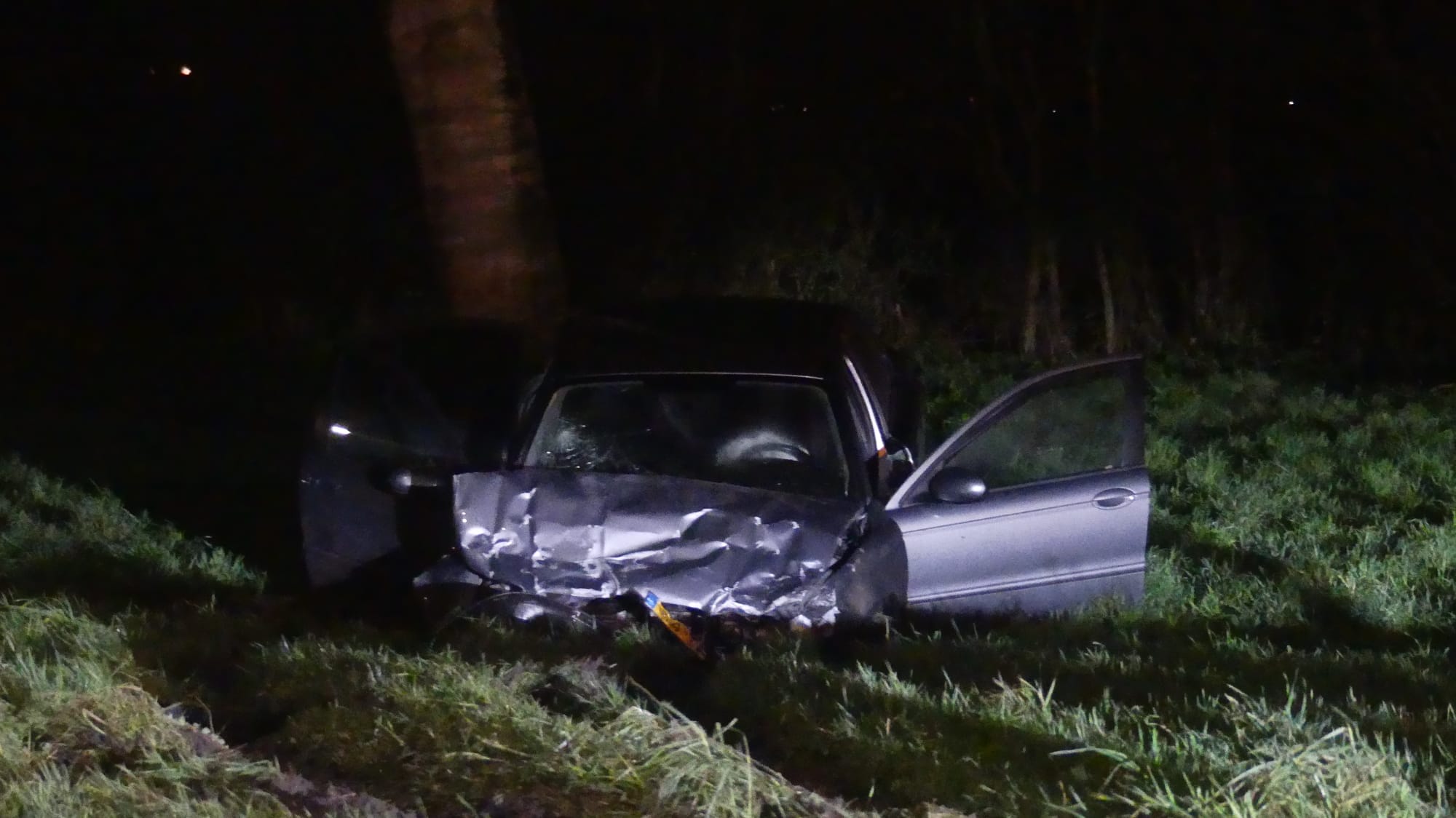 Een van de auto’s is totaal vernield, terwijl de andere in een greppel naast de weg terechtkwam. De weg is bezaaid met brokstukken en er is minstens één paal geraakt.