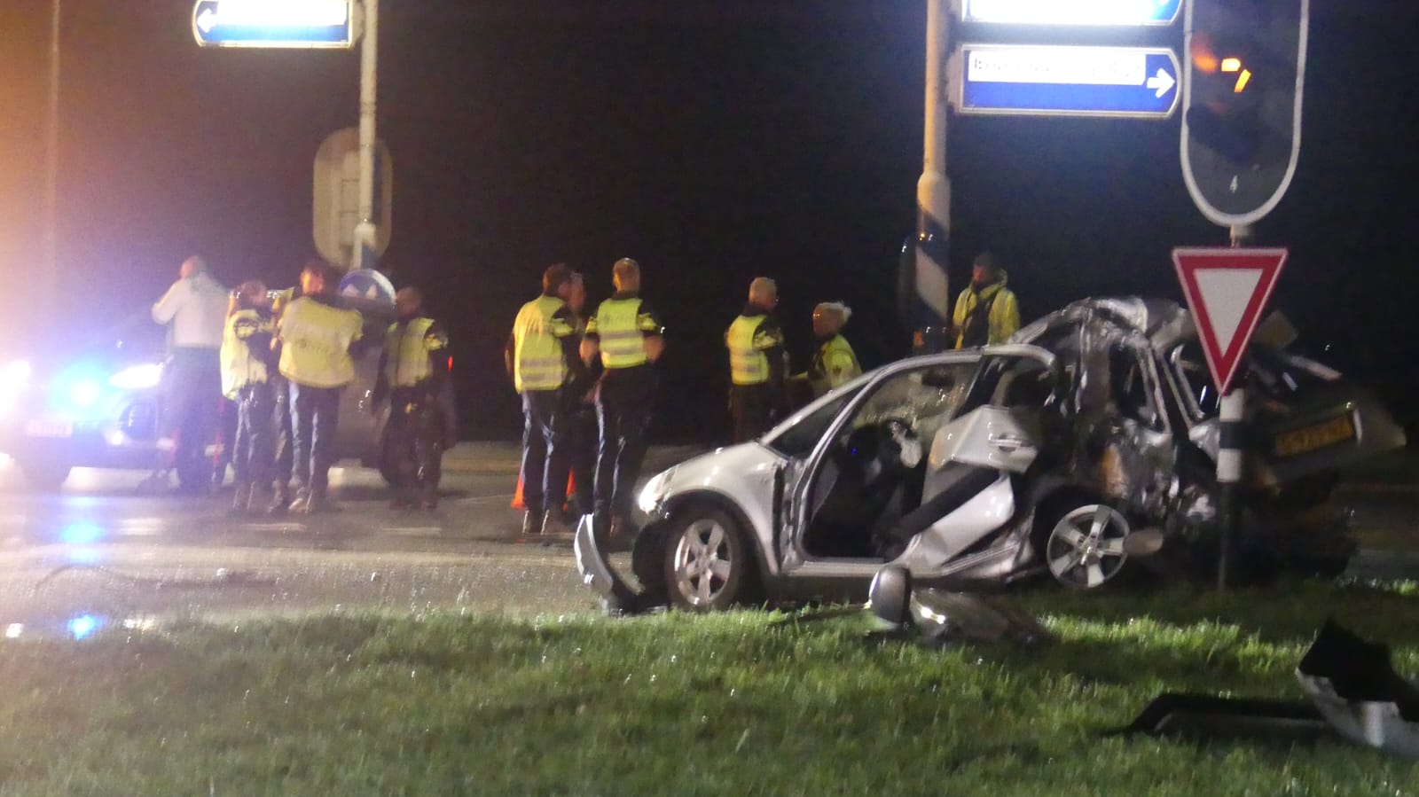 Een van de auto’s is totaal vernield, terwijl de andere in een greppel naast de weg terechtkwam. De weg is bezaaid met brokstukken en er is minstens één paal geraakt.