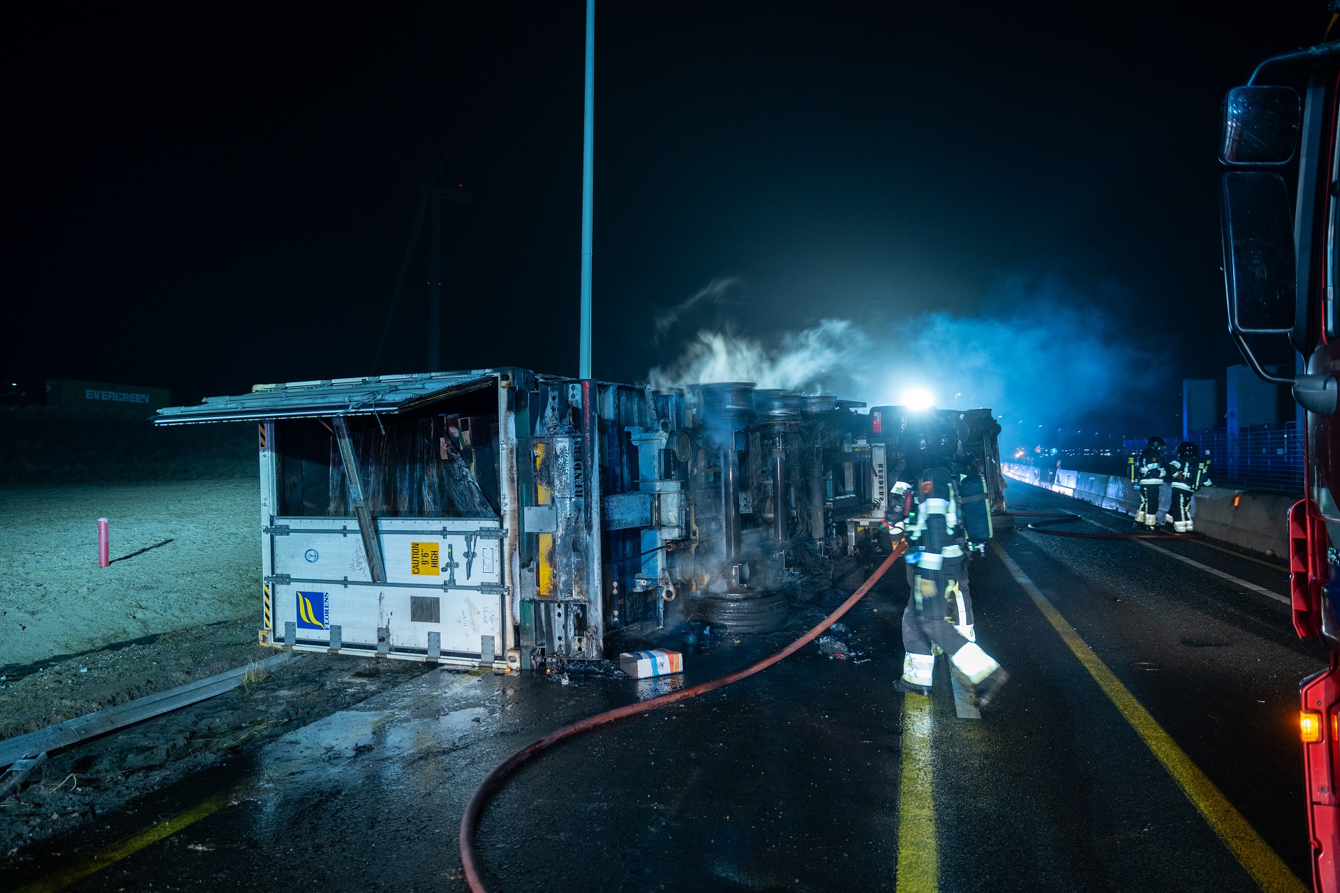 De chauffeur liep hierbij brandwonden op. Twee ambulances, een traumahelikopter rukten uit om eerste hulp te verlenen., De brandweer kwam met veel materieel ter plaatse. Onder meer een speciale schuimblusser kwam naar de plek des onheils.