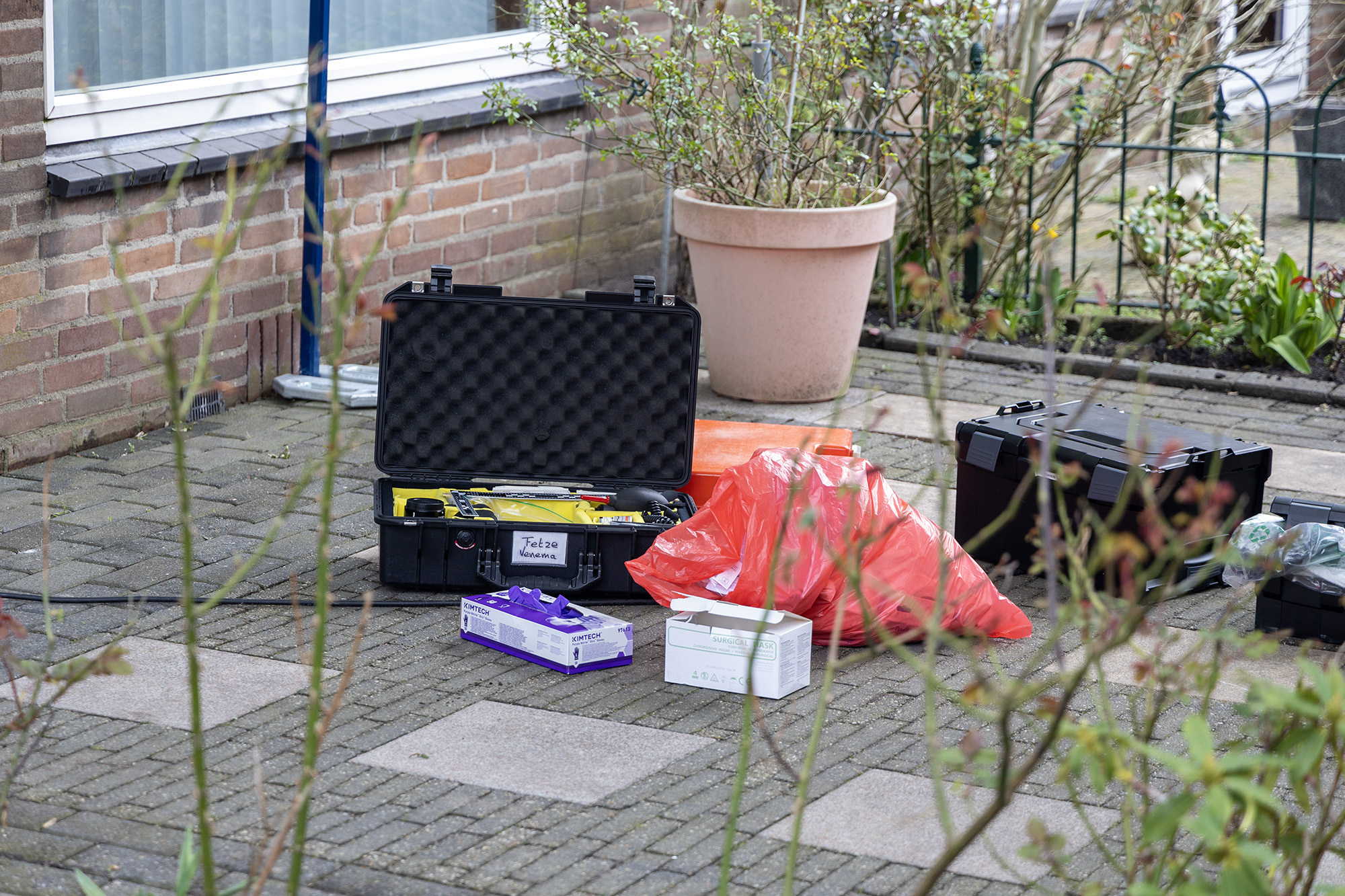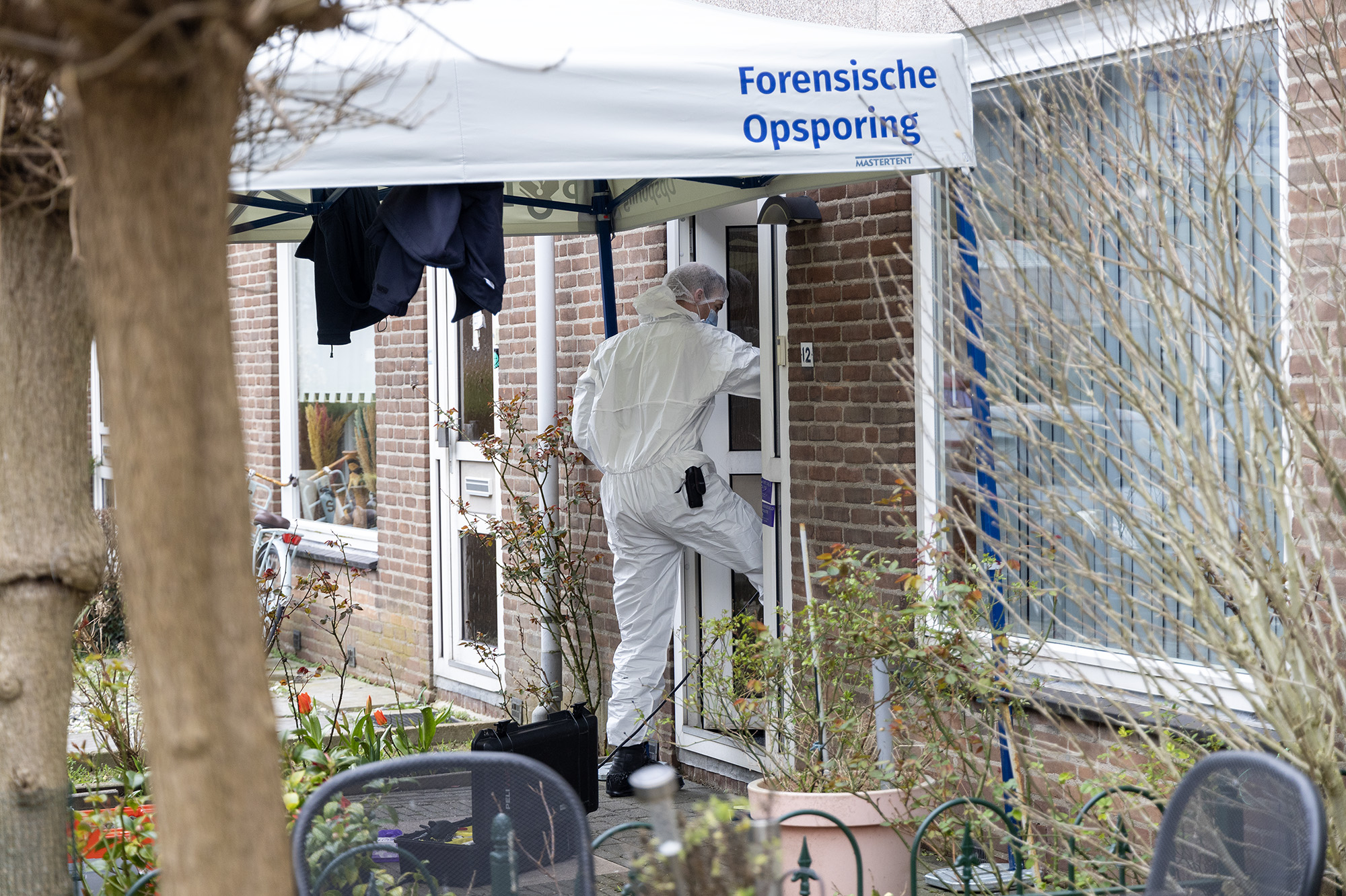 Voor de woning staat een grote PD-unit van de politie. Op dinsdag is het onderzoek in de woning nog in volle gang. Medewerkers van de Forensische Opsporing doen in witte pakken onderzoek in de woning.