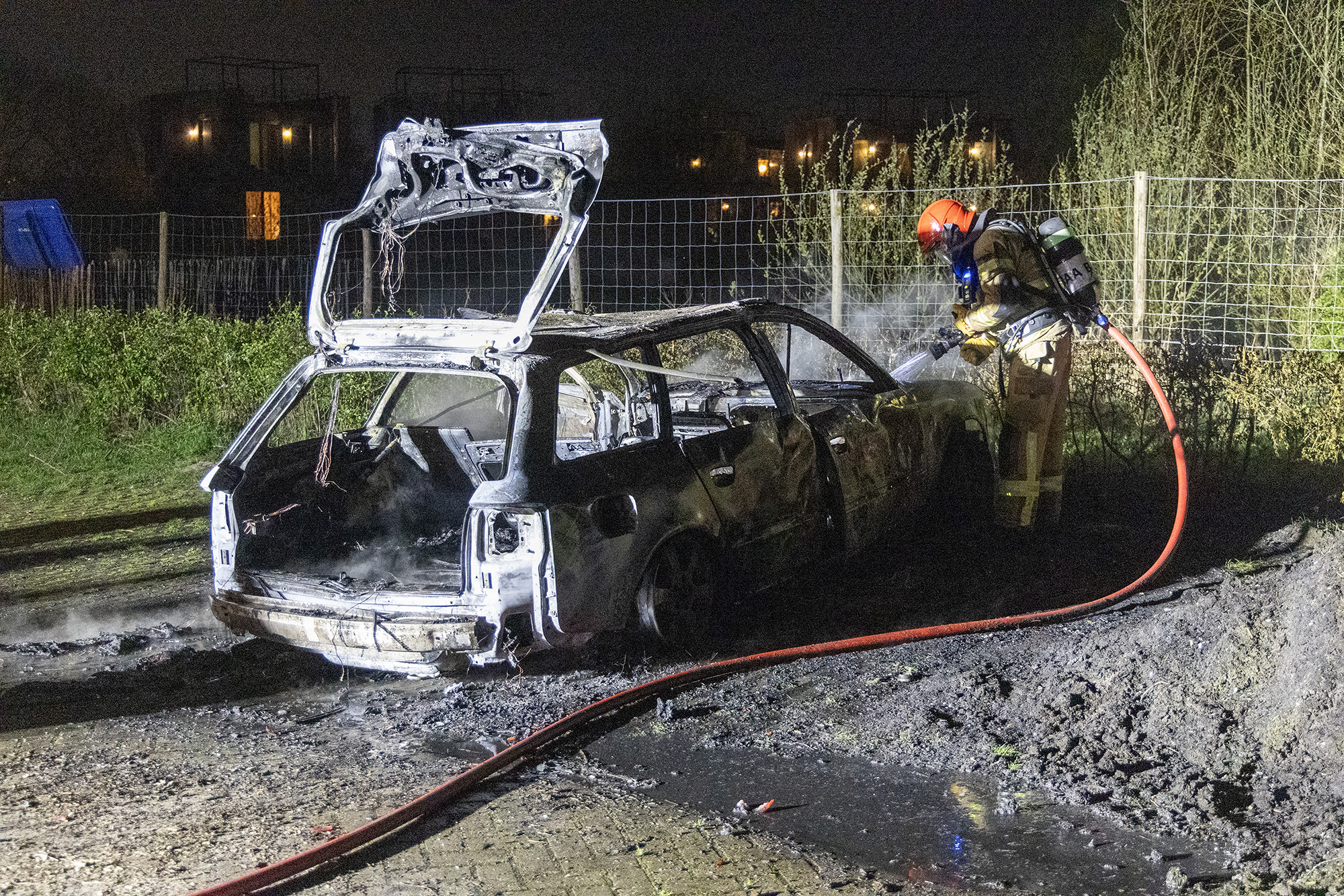Bij aankomst van de brandweer stond de wagen helemaal in lichterlaaie. De brandweer heeft de autobrand geblust, maar van de wagen bleef niet veel meer over.