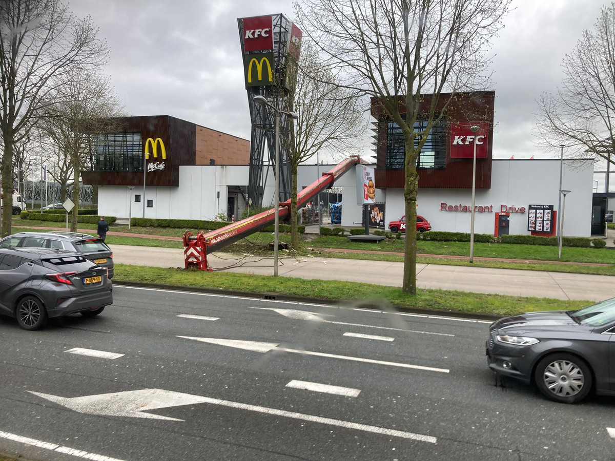 De kraan van Wagenborg Nedlift leunt op het dak van de KFC, waarbij de cabine in de lucht hangt. De oorzaak van het incident is nog onbekend, de locatie is afgezet met rood-witte linten. De machinist van de mobiele kraan kwam met de schrik vrij en slaagde er in zelf uit de cabine te klauteren nadat de kraanwagen plotseling achterover kantelde terwijl hij in de cabine zat.