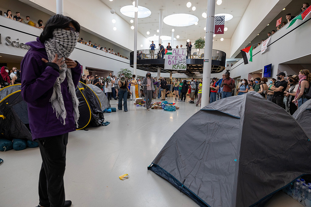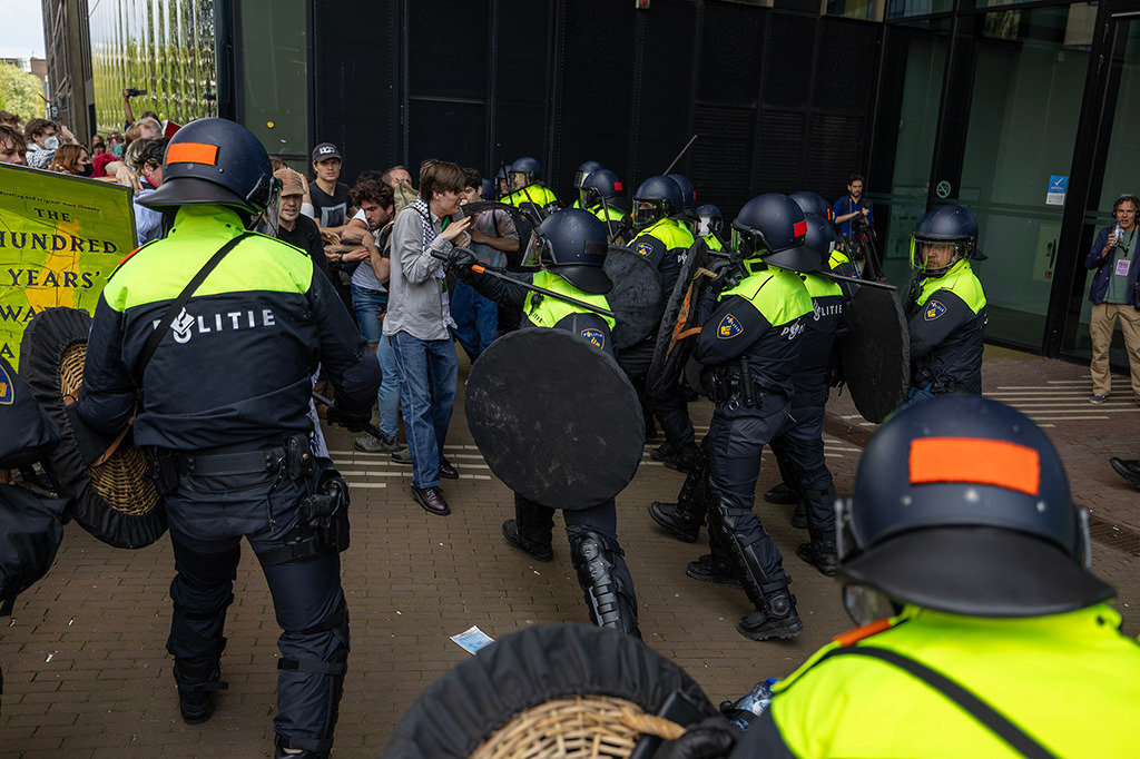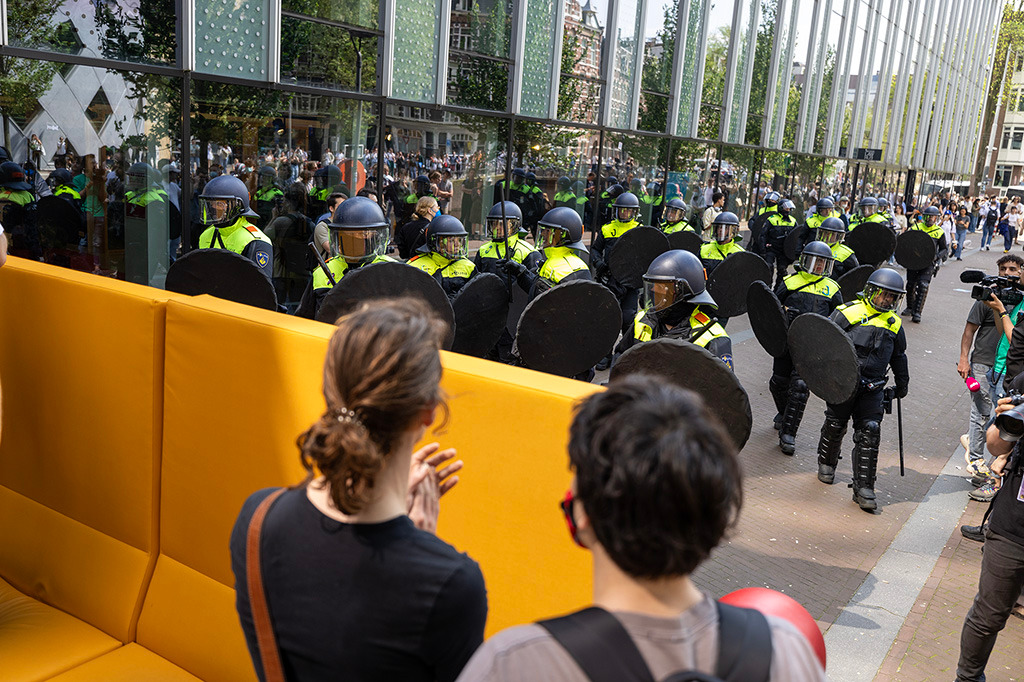 Honderden demonstranten zijn het gebouw van de UvA op Roeterseiland binnengegaan en hebben meerdere tenten opgezet in de hal van het gebouw. Er wordt herrie gemaakt met een trommel, en kampeerspullen worden het gebouw binnengebracht. Het meubilair van de kantine is naar buiten gesleept, en op verschillende plekken zijn vernielingen aangericht, waaronder graffiti met de tekst ‘van genocide’ op de muur.