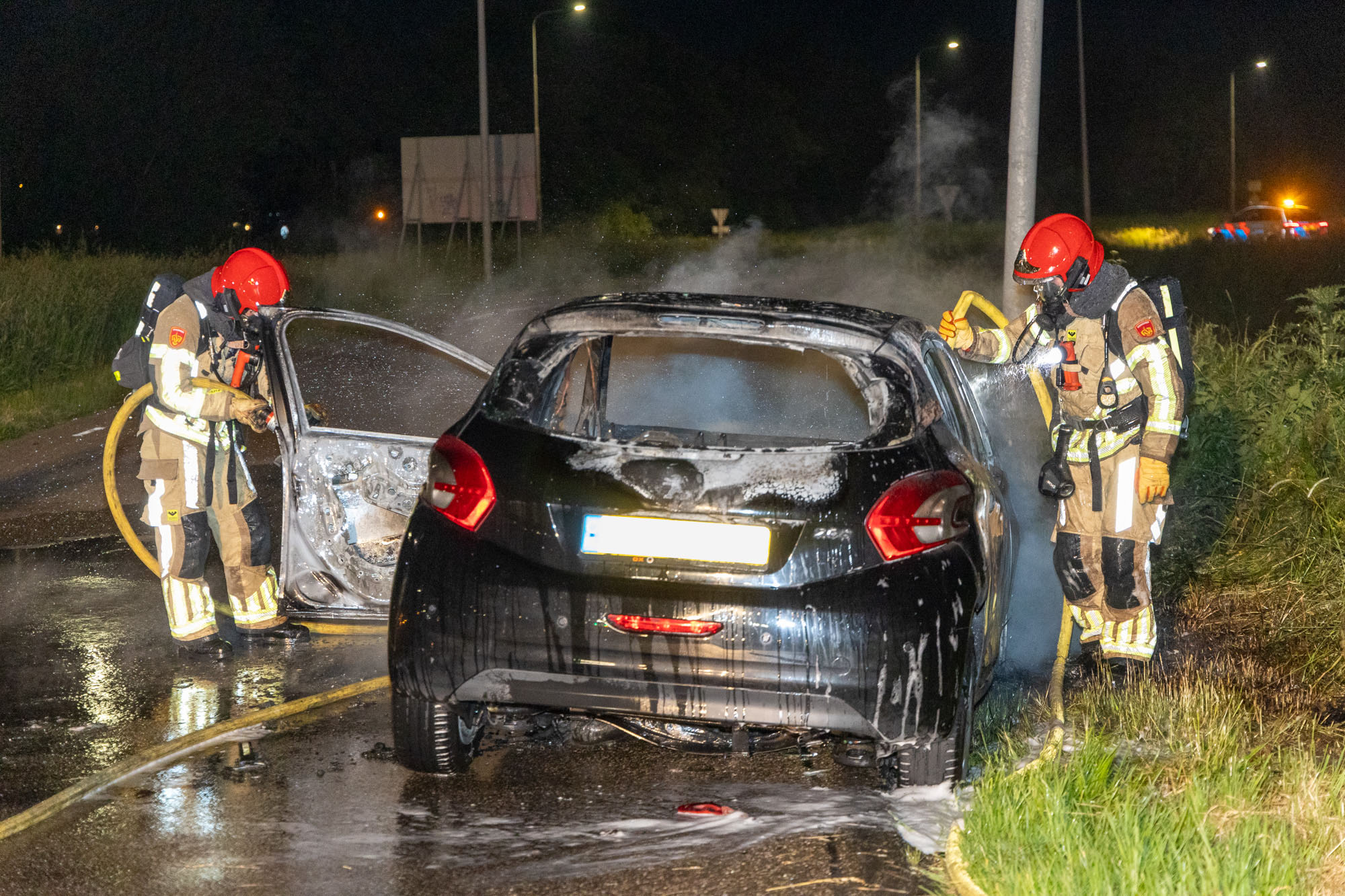 De brandweer heeft het voertuig weten te blussen, en kon overslag naar de bosjes kunnen voorkomen. Een berger zal het voertuig afslepen. Hoe de brand is ontstaan is niet bekend, vermoedelijk zal kortsluiting de oorzaak zijn.