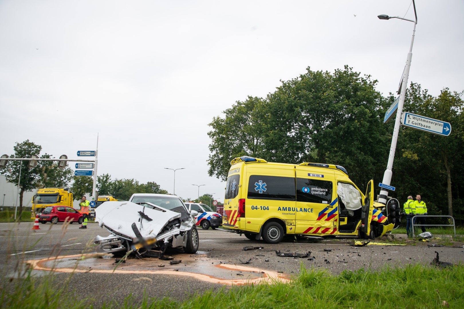 Het incident gebeurde op de kruising met de Oldeneelallee en Zalnéweg. Bij het ongeval kwam de ambulance tegen een ANWB-mast tot stilstand. De twee ambulancemedewerkers konden zelfstandig uitstappen en werden nagekeken door een gealarmeerde ambulance. Ze hoefden niet naar het ziekenhuik, ze waren flink geschrokken en worden opgevangen op de ambulancepost. De automobilist raakte wel gewond en is met onbekend letsel naar het ziekenhuis vervoerd.