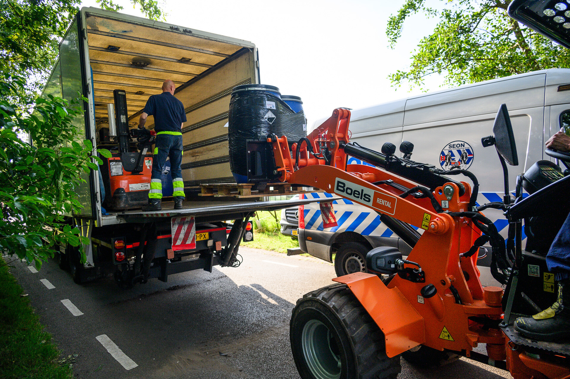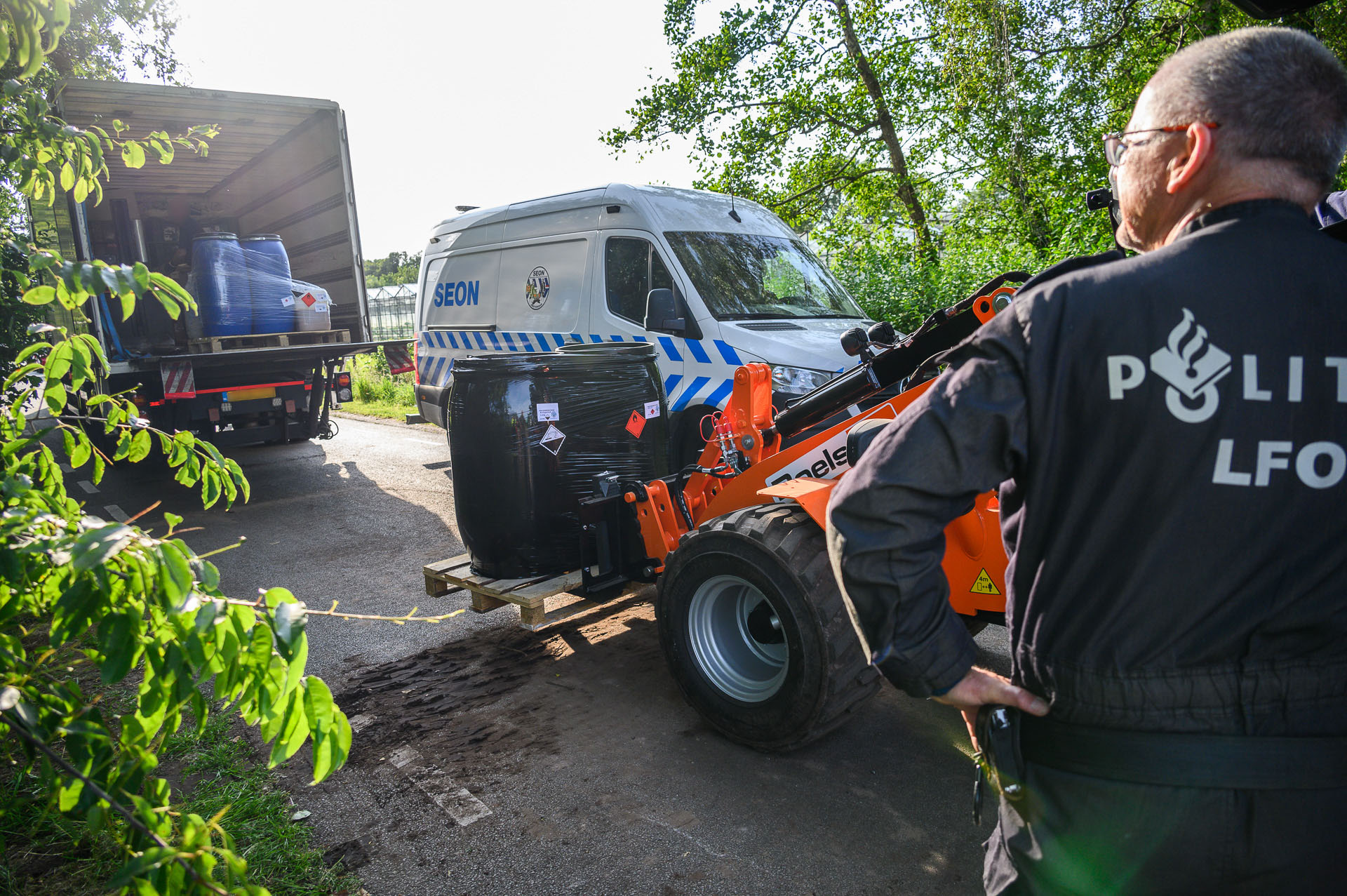 Gespecialiseerde agenten zijn al twee dagen ter plaatse, en er zijn voertuigen van SEON, een bedrijf dat helpt bij het ontmantelen van drugslabs. Op beelden is te zien hoe drugsvaten in een vrachtwagen worden geladen. Het is nog onduidelijk welke drugs er werden geproduceerd.