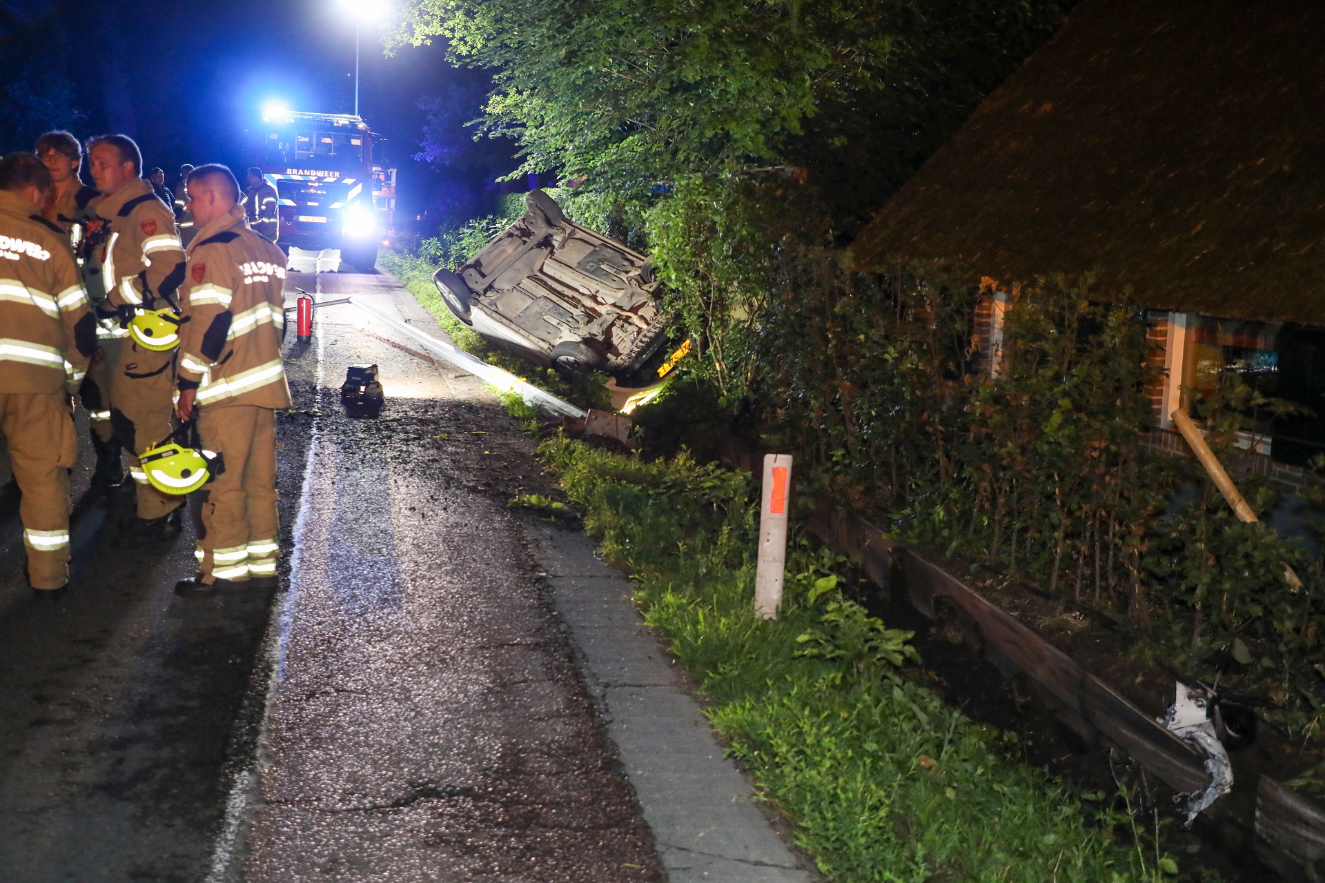 Eerder zaterdagmiddag vloog iets verderop ook al een auto uit de bocht. Van de drie inzittenden gingen er twee, waaronder de bestuurder, er vandoor.