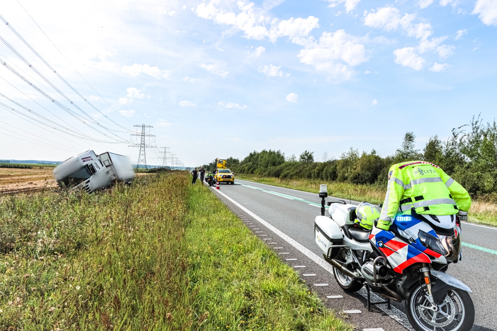 Politie en een ambulance kwamen met spoed ter plekke. De vrachtwagen kwam door nog onbekende oorzaak in de greppel terecht. De chauffeur raakte hierbij niet gewond. Wel is hij kort onderzocht door het ambulancepersoneel op verwondingen. De vrachtwagen zal worden geborgen door een bergingsbedrijf.