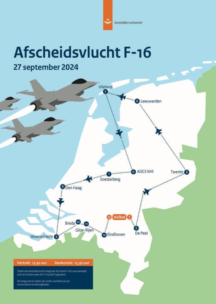 De laatste toestellen zullen een afscheidsronde maken boven Nederland, waarbij ze onder andere over Soesterberg vliegen. Vanaf de luchtmachtbasis Volkel zullen om 13.00 uur minimaal zes F-16’s vertrekken en verschillende locaties aandoen waar ze in het verleden actief waren, waaronder Soesterberg.