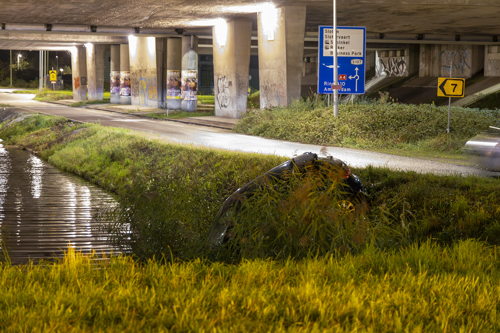 De auto was doorgeschoten op de Anderlechtlaan in Amsterdam en stond met zijn neus in de sloot.