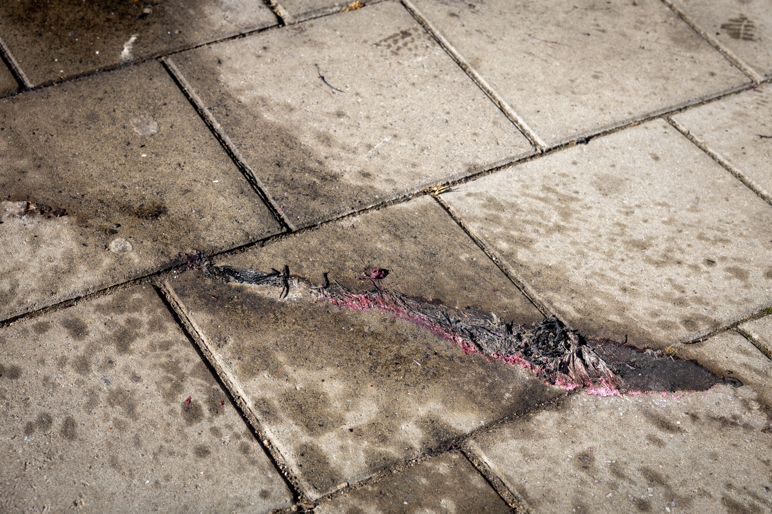 Explosie voor ingang van flat: gesmolten plastic op de grond en sterke benzinelucht geroken