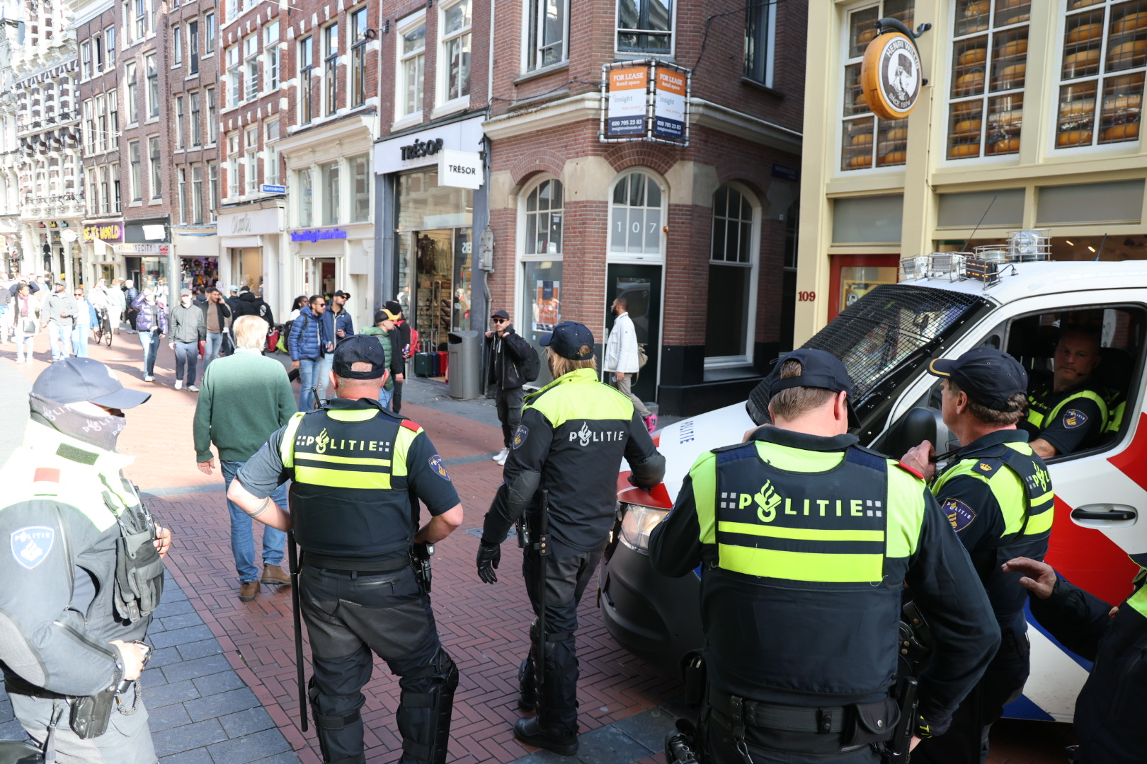 De politie en ME sloten tientallen demonstranten in bij het Centraal Station, waar ook het tramverkeer werd geblokkeerd.