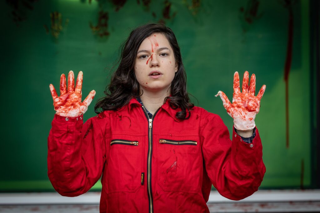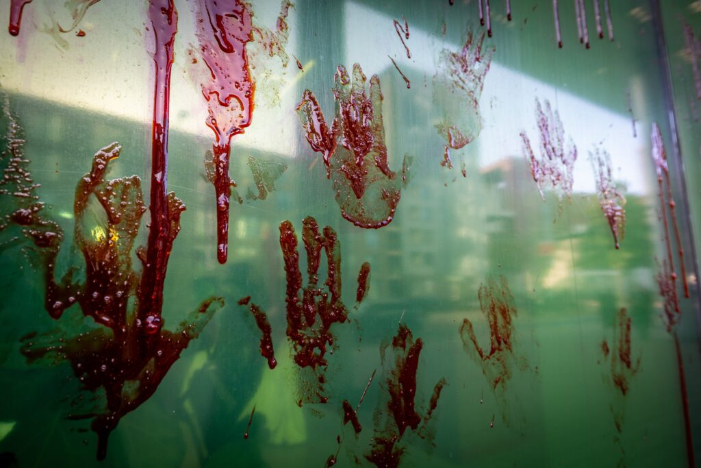 ROTTERDAM – Actievoerders van XR Justice Now! hebben maandagochtend het hoofdkantoor van KPN op de Kop van Zuid besmeurd met nepbloed als protest tegen de aankomende NEDS wapenbeurs in Ahoy, die op 21 november plaatsvindt. KPN, hoofdsponsor van het evenement, staat centraal in het protest.