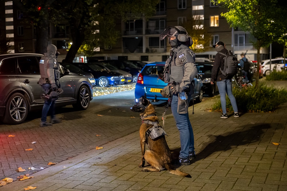 Het arrestatieteam van de Afdeling Interventie voerde om 02:10 uur een inval uit in een woning aan de Bosseplaat in Rozenburg, waarbij een speciaal getrainde hond werd ingezet. De hond droeg een masker met een camera en een lamp om het team te ondersteunen bij de operatie.