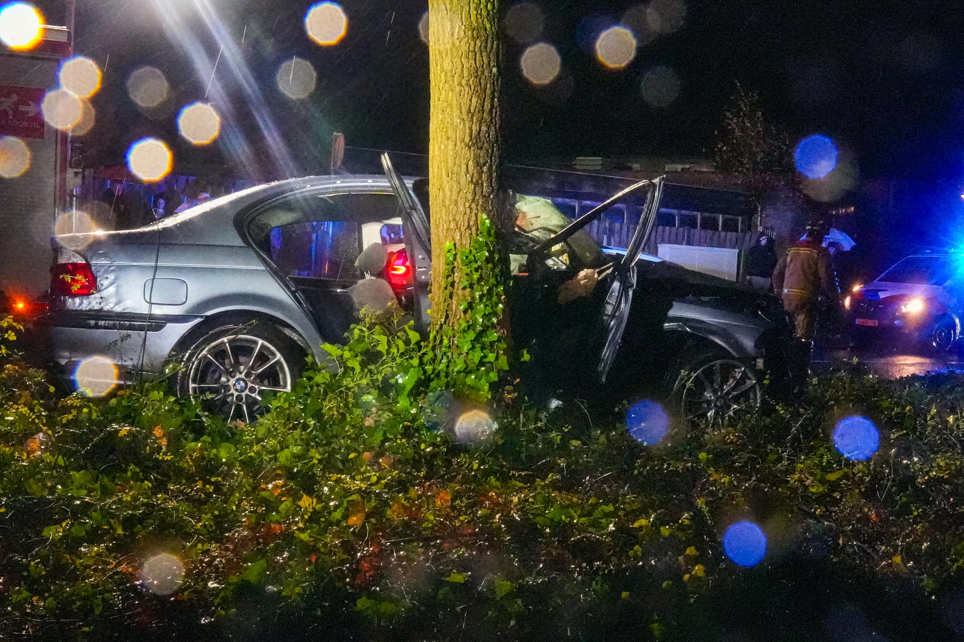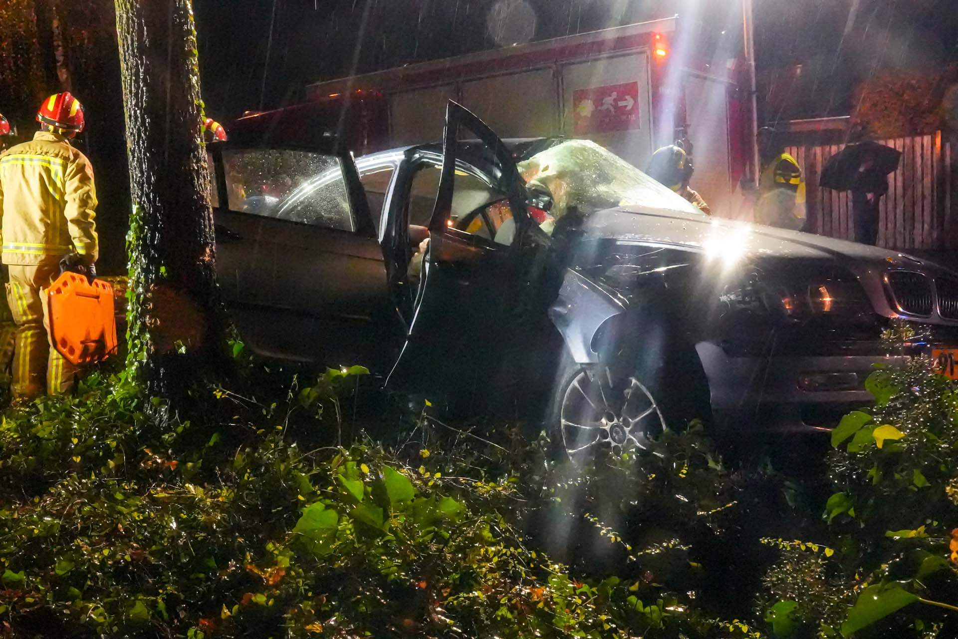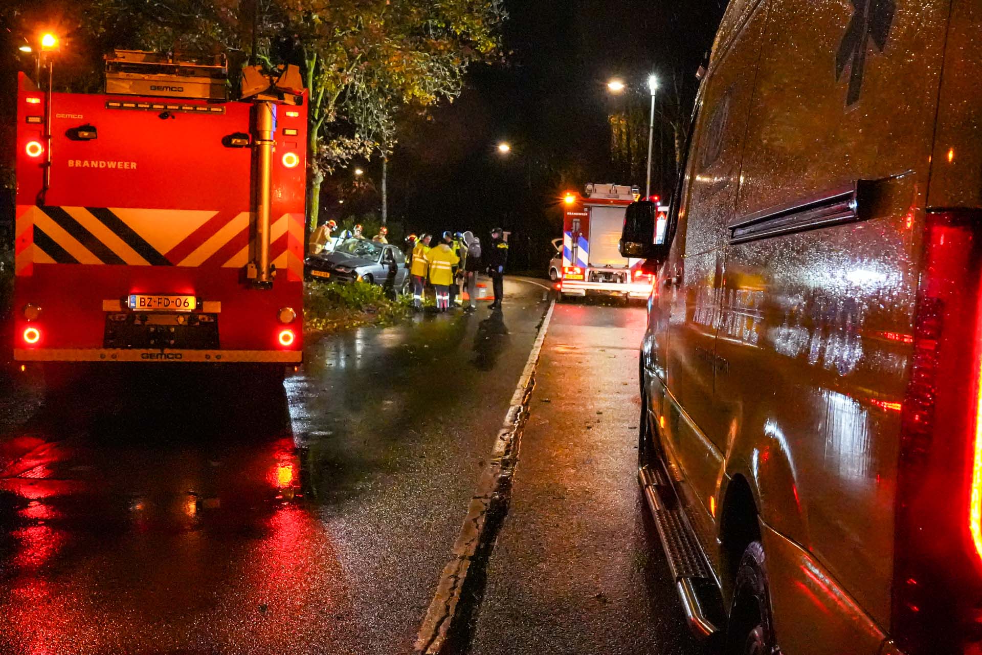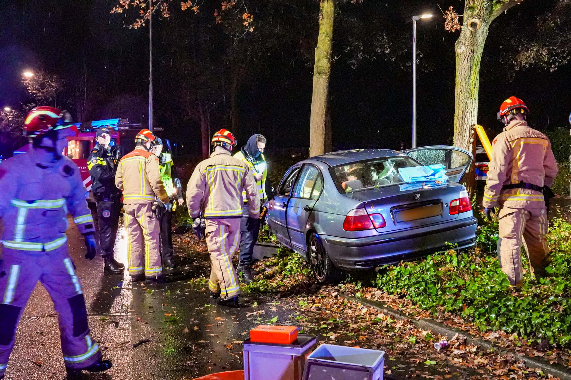Auto raakt na flauwe bocht van de weg en crasht tegen boom, inzittenden naar het ziekenhuis