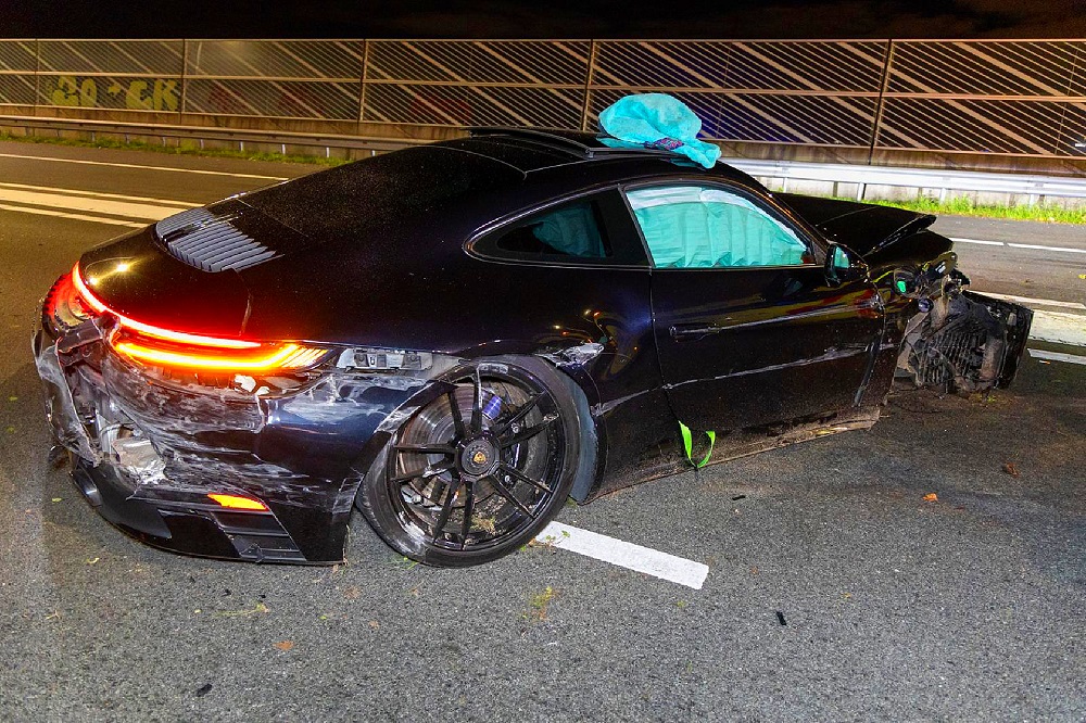 De Porsche, met een geschatte waarde van 243.000 euro, reed vermoedelijk veel te hard. Door de klap brak een voorwiel af en liep de auto zware schade op.
