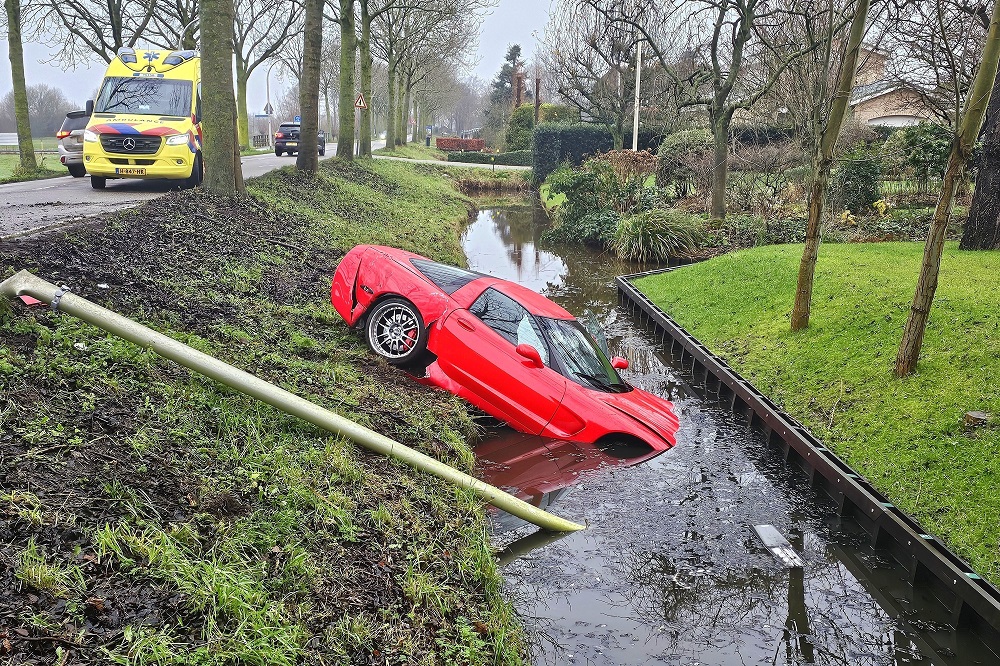 De politie handelde het incident ter plaatse af. Een bergingsbedrijf heeft de Corvette uit de sloot gehaald en afgesleept.