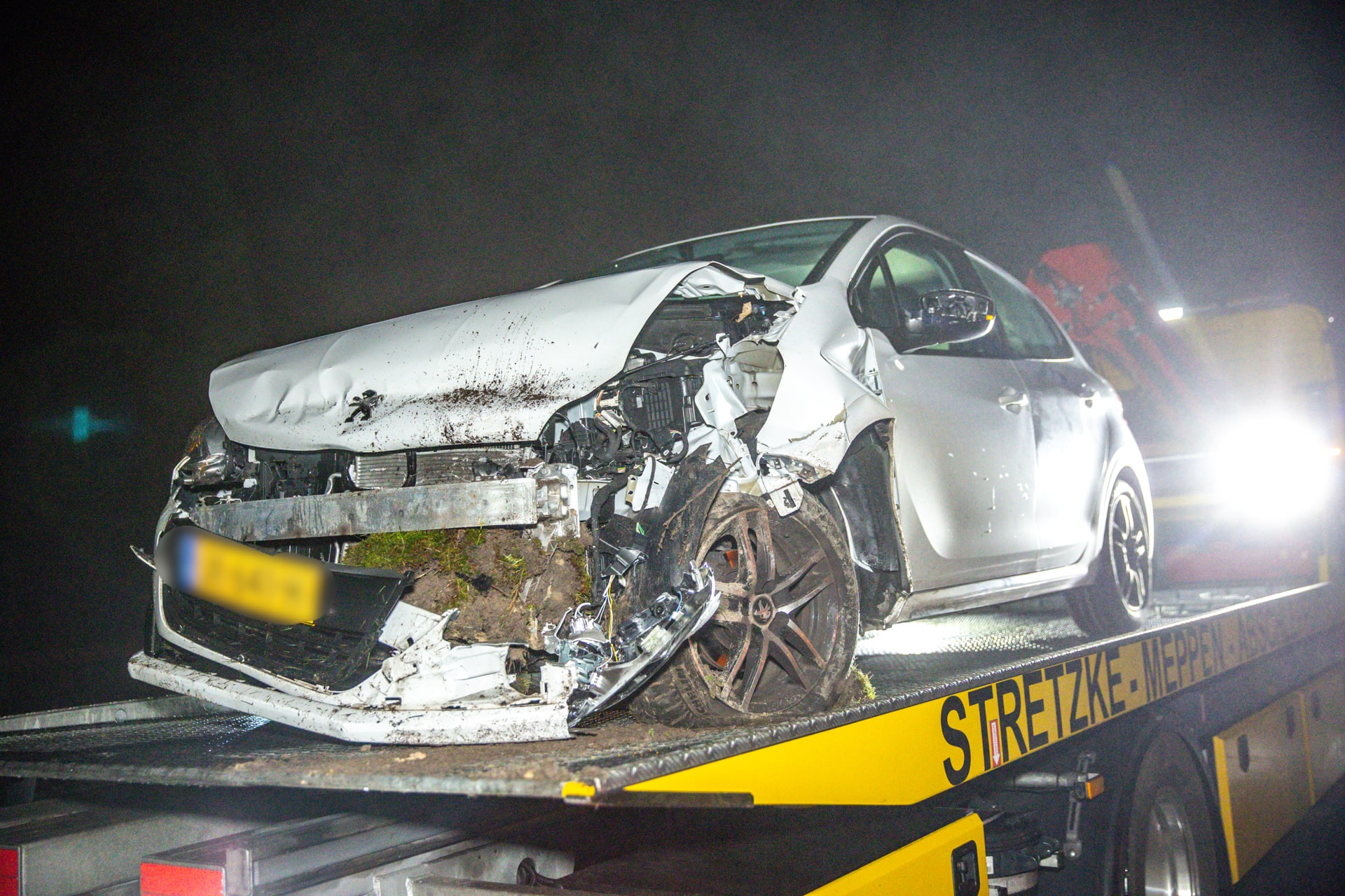 De afslag is tijdelijk afgesloten terwijl een bergingsbedrijf de beschadigde auto afvoert. De politie onderzoekt de precieze oorzaak van het ongeval.