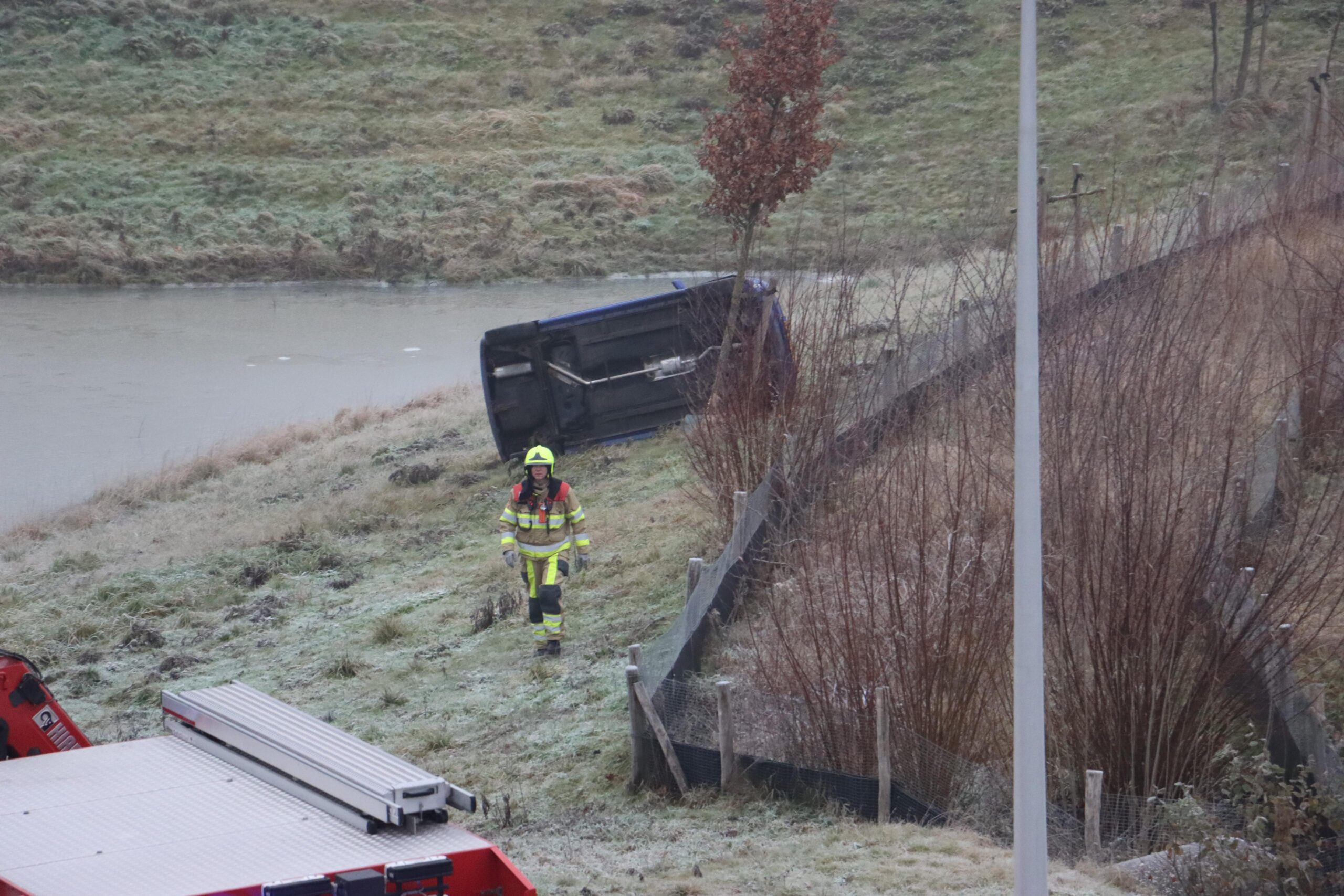 Een bergingsbedrijf is ingeschakeld om de auto uit de lastig bereikbare locatie te verwijderen. De oorzaak van het ongeval wordt onderzocht.
