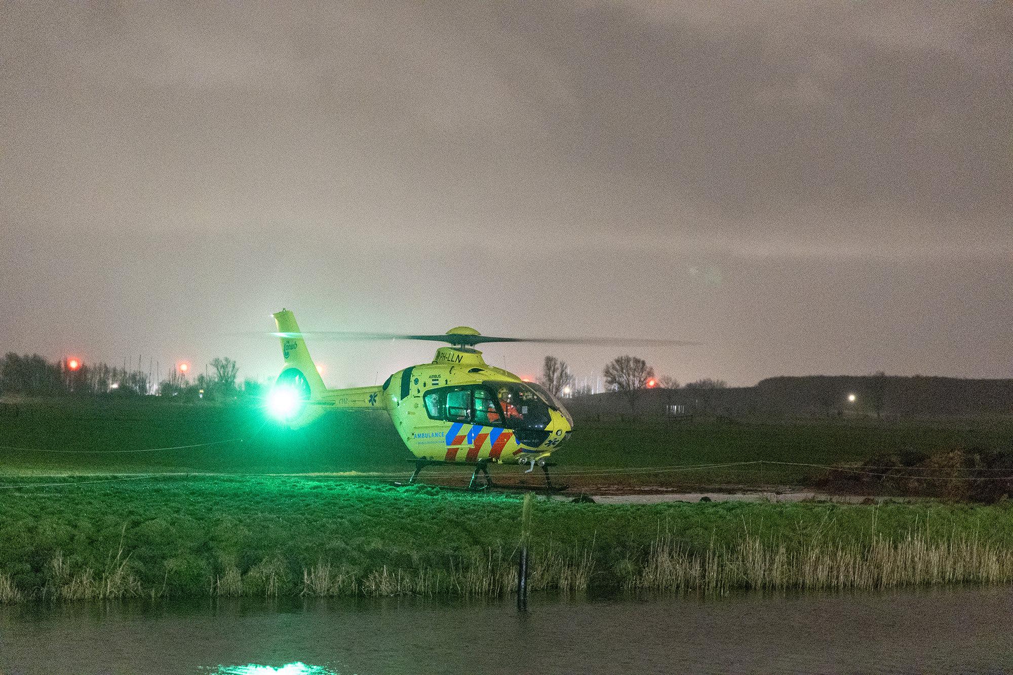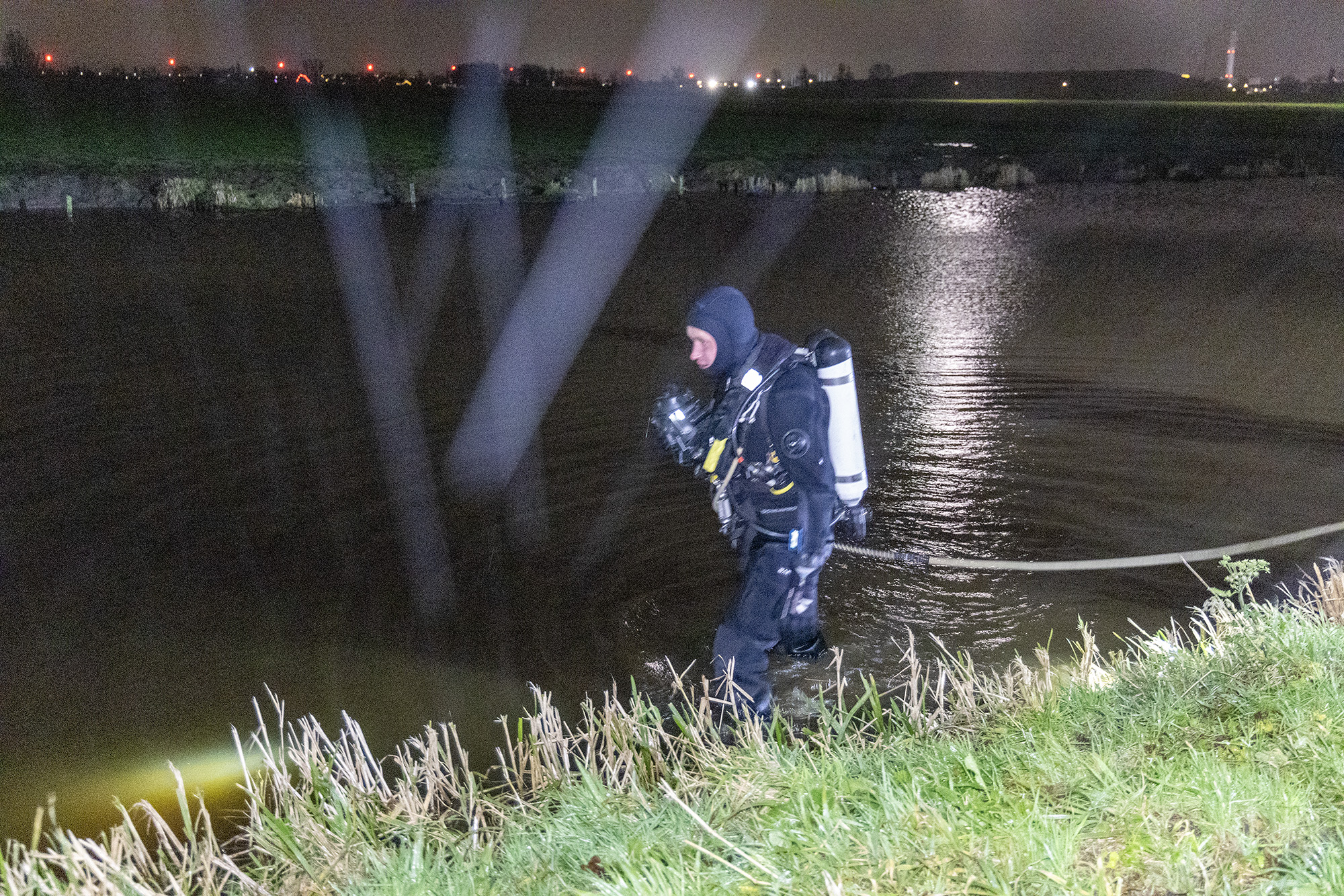 Een duiker van de brandweer maakte een zoekslag in het water naast het pad terwijl de traumahelikopter in het weiland ernaast landde. Uiteindelijk is er niemand in het water aangetroffen en lijkt de deelscooter te zijn gedumpt.