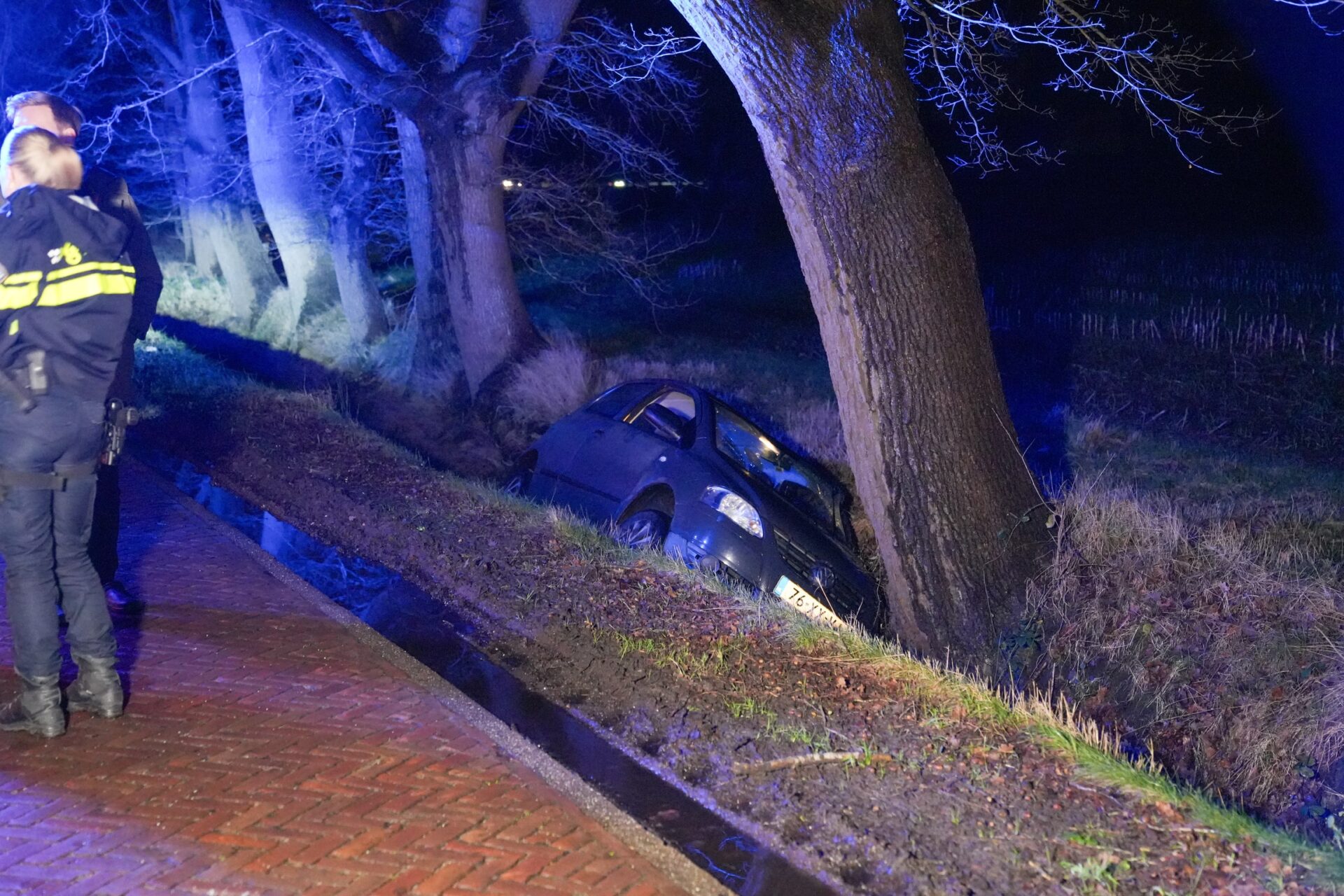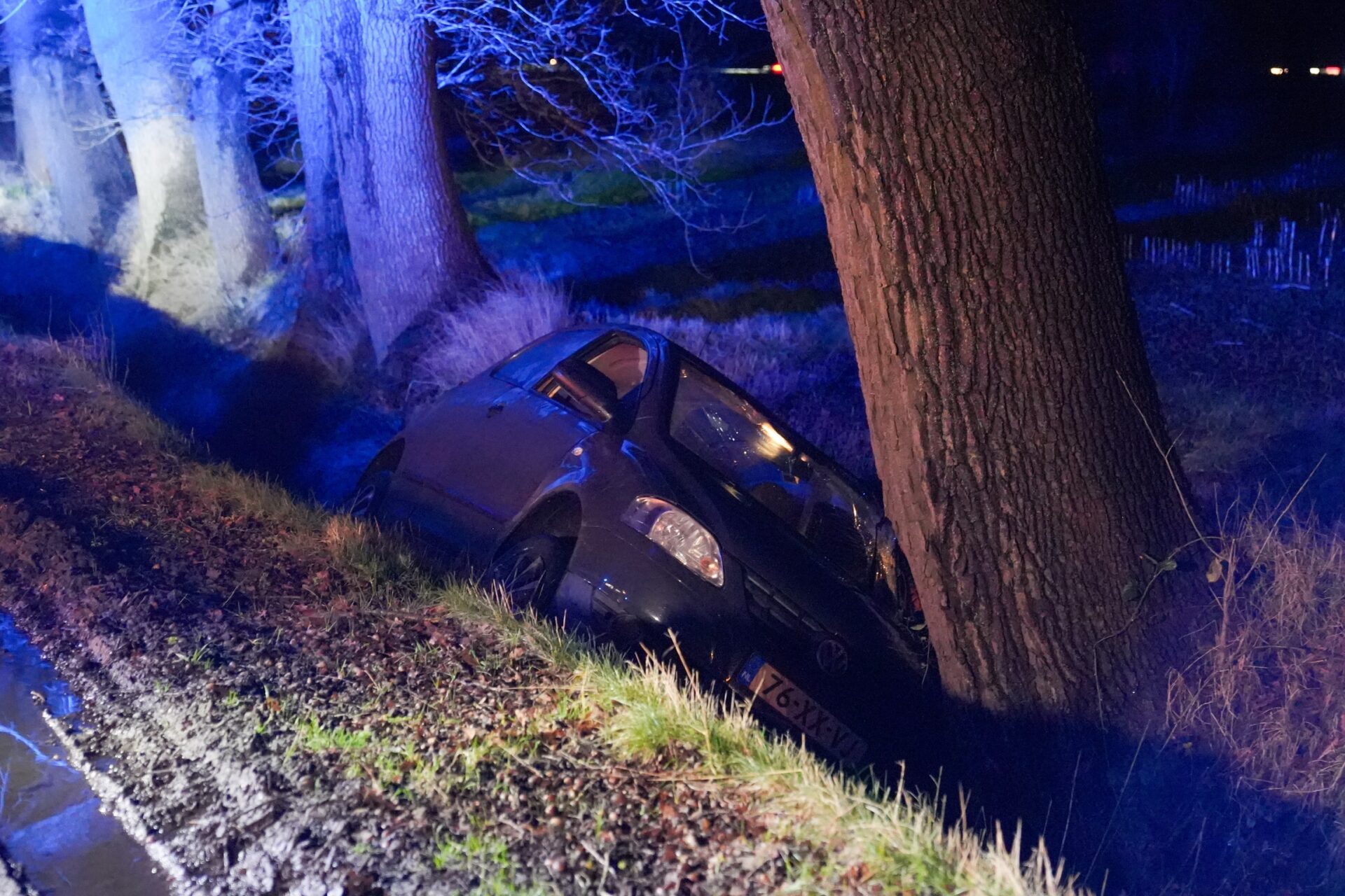 De auto, die ook een boom raakte en aanzienlijke schade opliep, wordt door een bergingsbedrijf weggesleept. De weg is tijdelijk afgesloten voor onderzoek naar de toedracht van het ongeval.