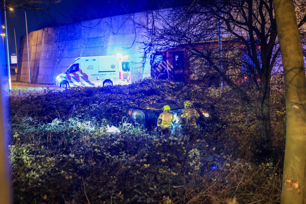 SCHIEDAM – Vrijdagavond rond 22:00 uur is een auto op zijn kant beland tussen de oprit en afrit van de A20 ter hoogte van Schiedam-Noord.