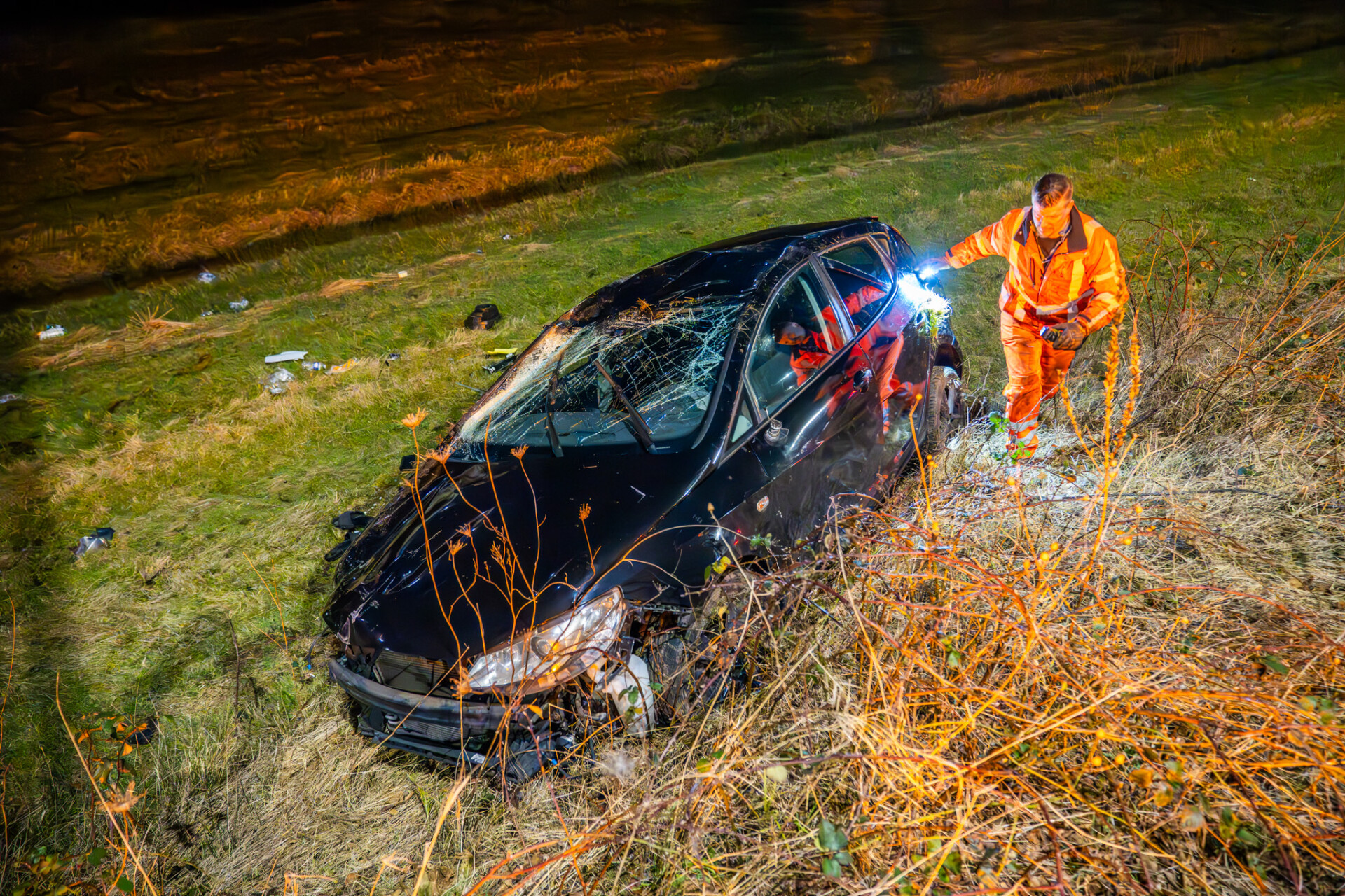 De bestuurder reed vermoedelijk met te hoge snelheid, verloor de controle over het stuur en miste op het nippertje een grote paal met een verkeersbord. Hij werd in de ambulance nagekeken, maar hoefde niet naar het ziekenhuis.
