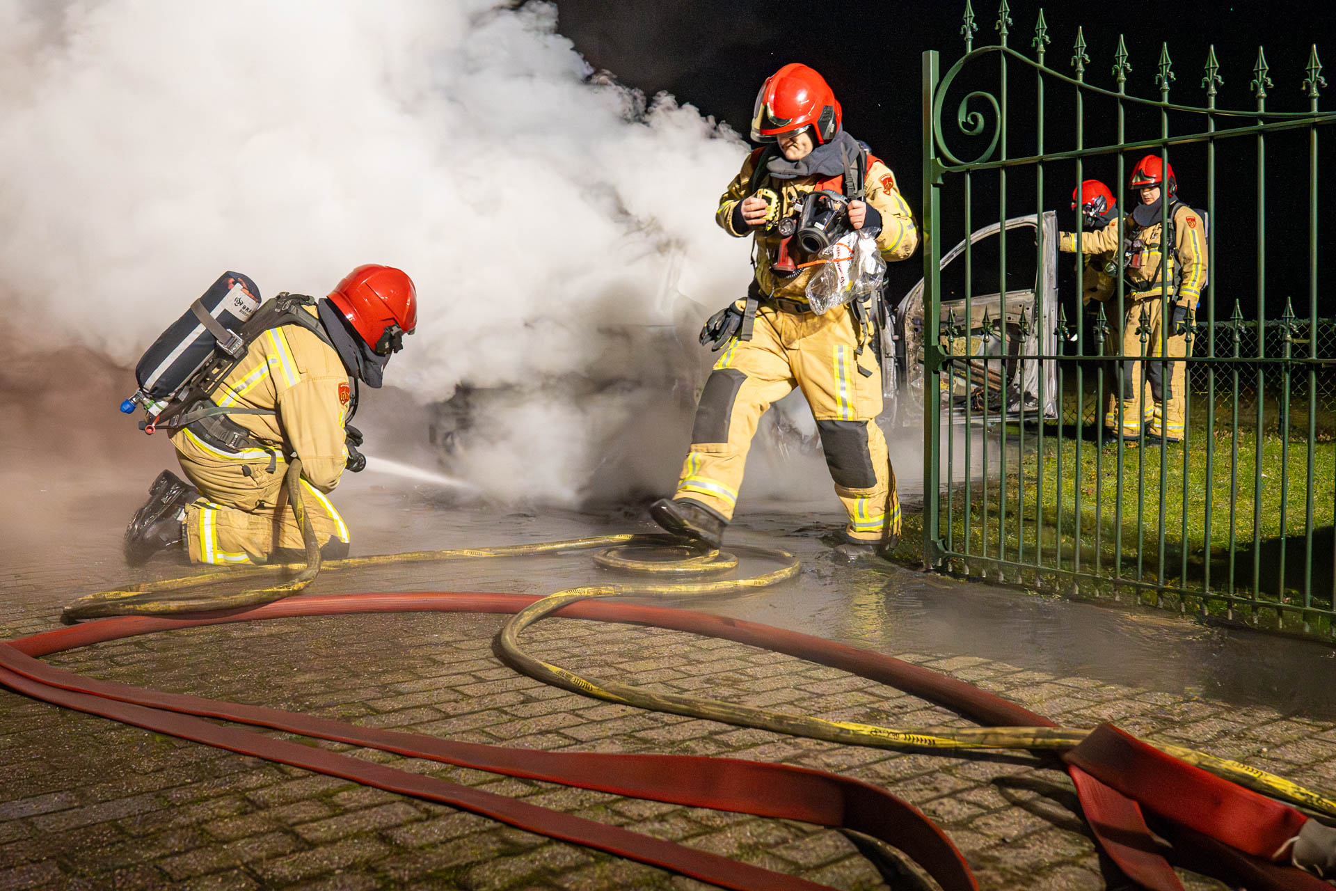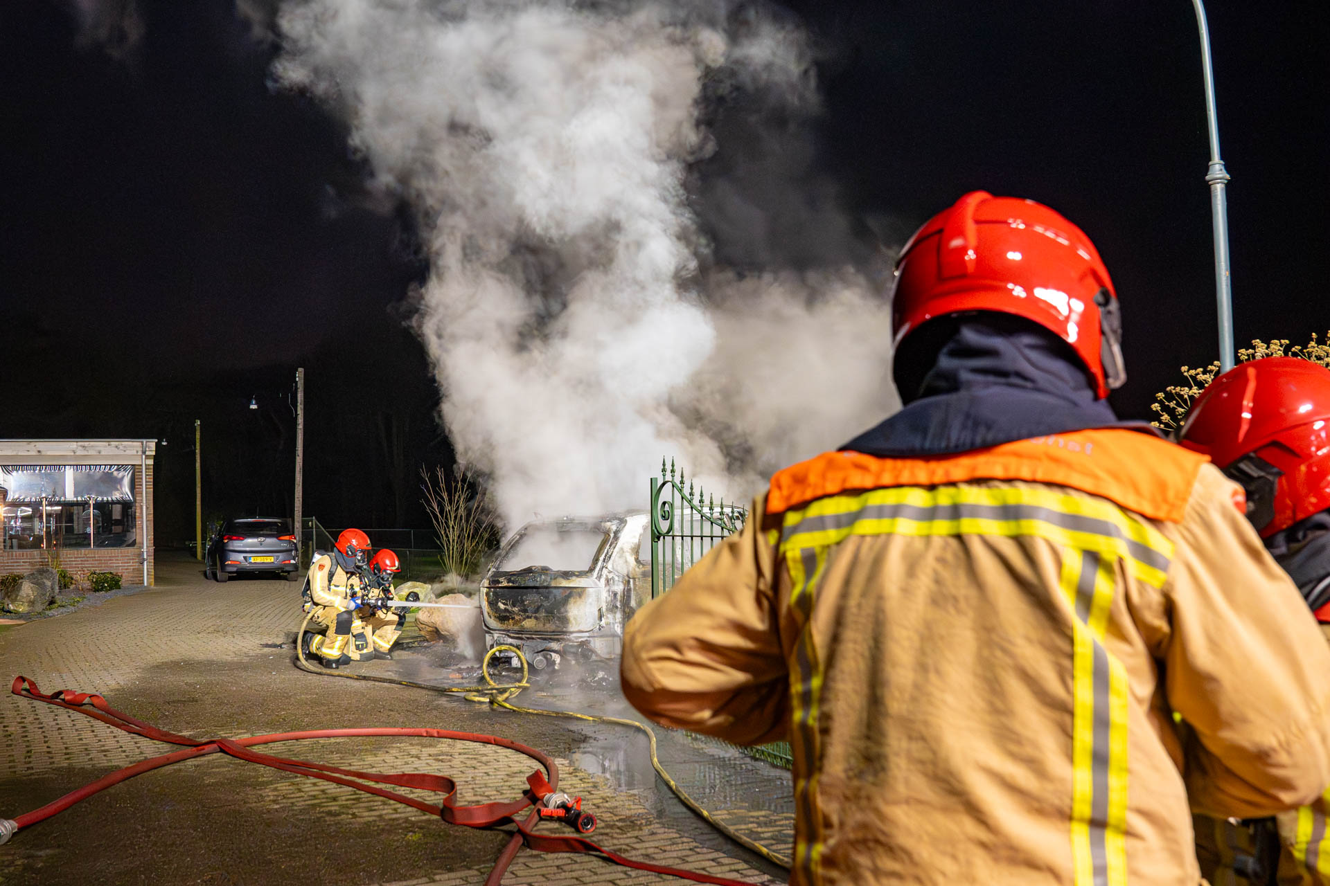 De brandweer volgde de procedure voor gevaarlijke stoffen vanwege het accupakket. Een technische storing is vermoedelijk de oorzaak. De auto is total loss.