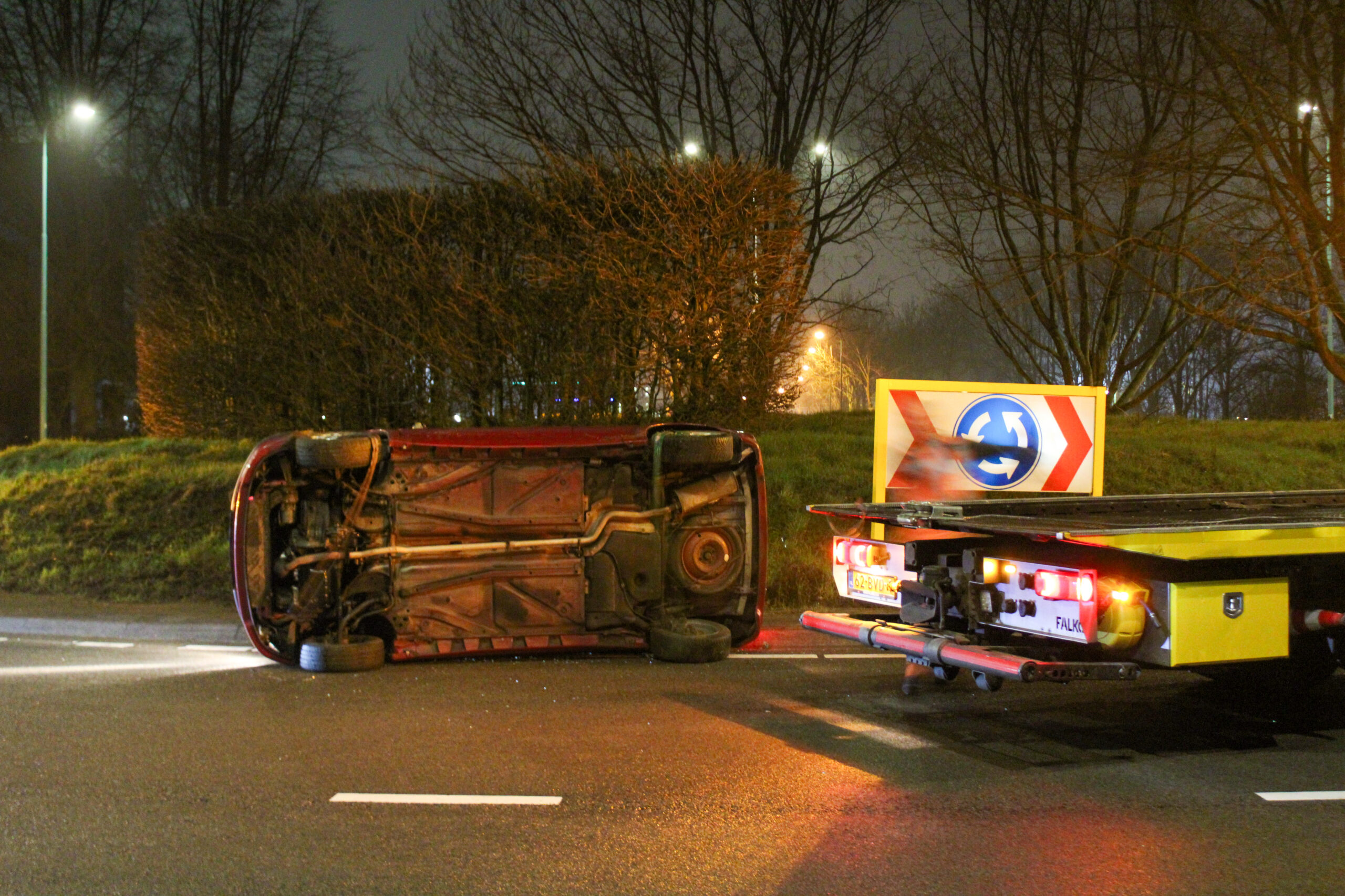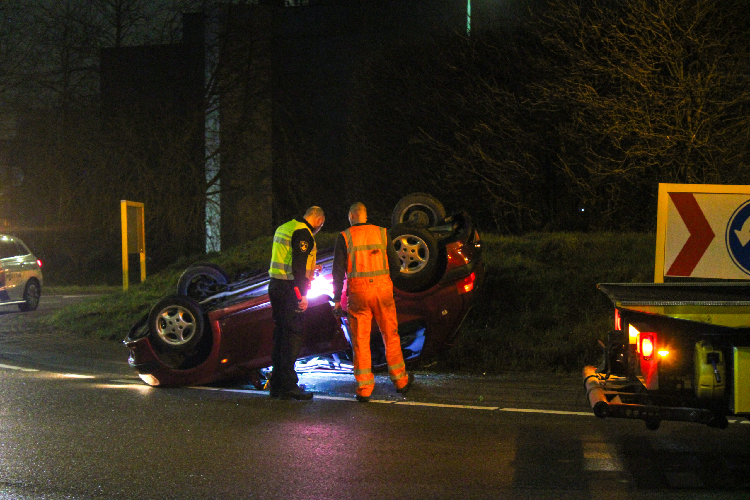 VEENENDAAL – In de nacht van zaterdag op zondag rond 00.30 uur is een auto over de kop geslagen op de Rondweg-Oost bij de rotonde met de Wageningselaan in Veendendaal.