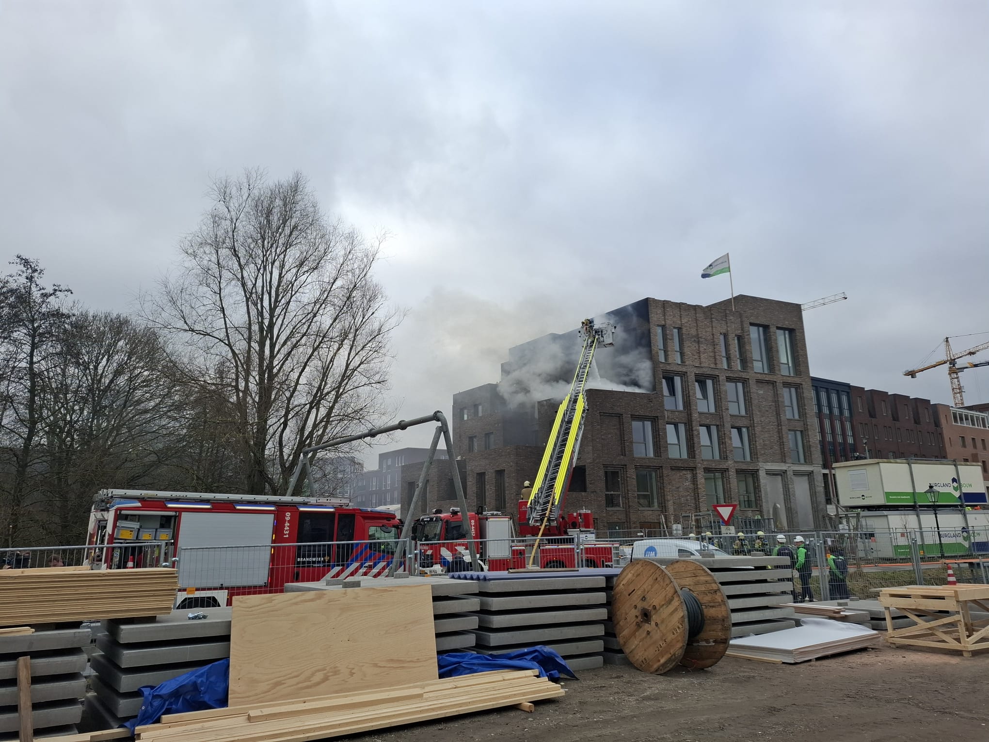 Het vuur is inmiddels onder controle. Door de opgelopen schade kan de oplevering van het nieuwbouwcomplex vertraging oplopen.