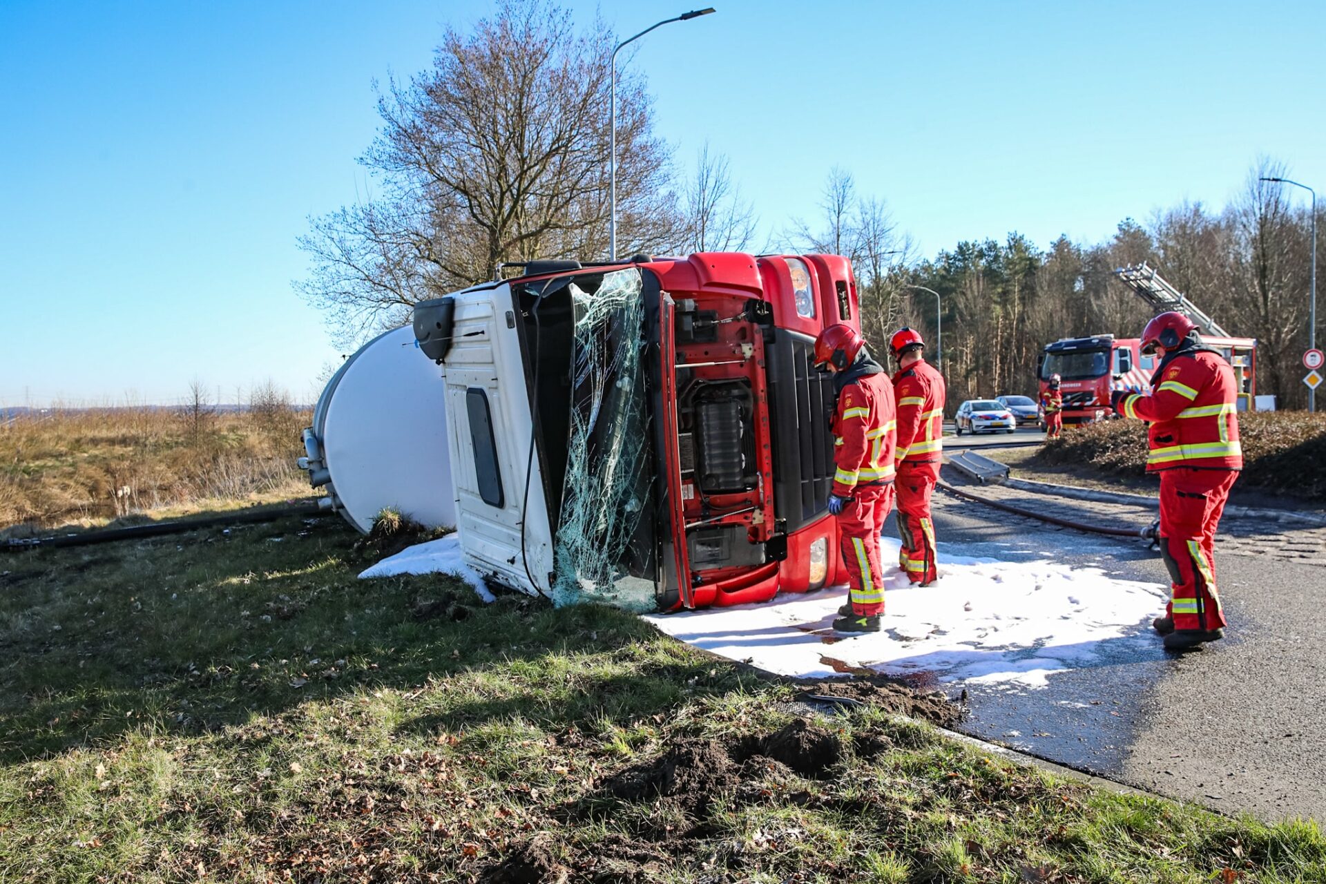 Het ongeval gebeurde rond 09.07 uur. Hulpdiensten, waaronder een traumahelikopter, werden opgeroepen. De bestuurder kon zichzelf bevrijden door de voorruit in te trappen. Hij is door ambulancepersoneel gecontroleerd, maar bleef ongedeerd.