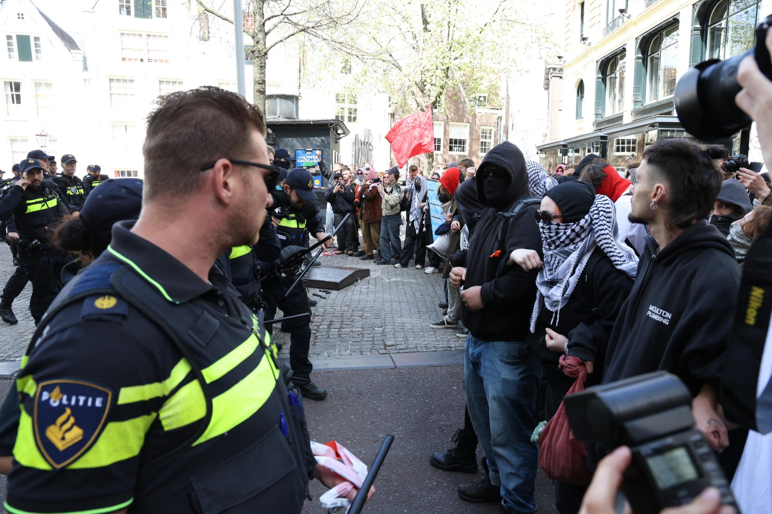 AMSTERDAM – De bezetting van het Maagdenhuis in Amsterdam door pro-Palestijnse demonstranten heeft maandagmiddag geleid tot meerdere confrontaties met de Mobiele Eenheid. Agenten hebben ingegrepen bij pogingen van betogers om het pand via een zijdeur te verlaten. Demonstranten gebruikten grote schilden om zich te beschermen tegen de wapenstokken van de ME, die hen terug probeerde te dringen. Op beelden is te zien hoe agenten soms die schilden wegrukken.
