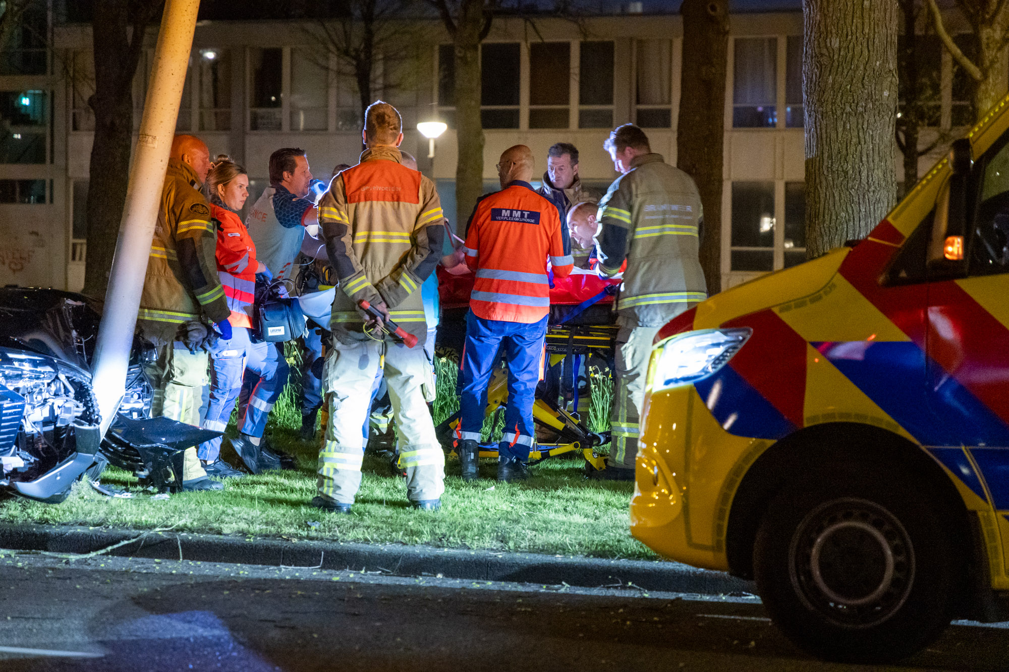Even voor twaalf uur troffen omstanders de automobilist aan met een voertuig tegen de lantaarnpaal. Hulpdiensten waren snel ter plaatse, en hebben het slachtoffer direct op straat gereanimeerd. Het MMT (Mobiel Medisch Team) was ook snel aanwezig. Het slachtoffer is reanimerend door de hulpdiensten overgedragen richting de ambulance en daarna met spoed naar het ziekenhuis vervoerd.