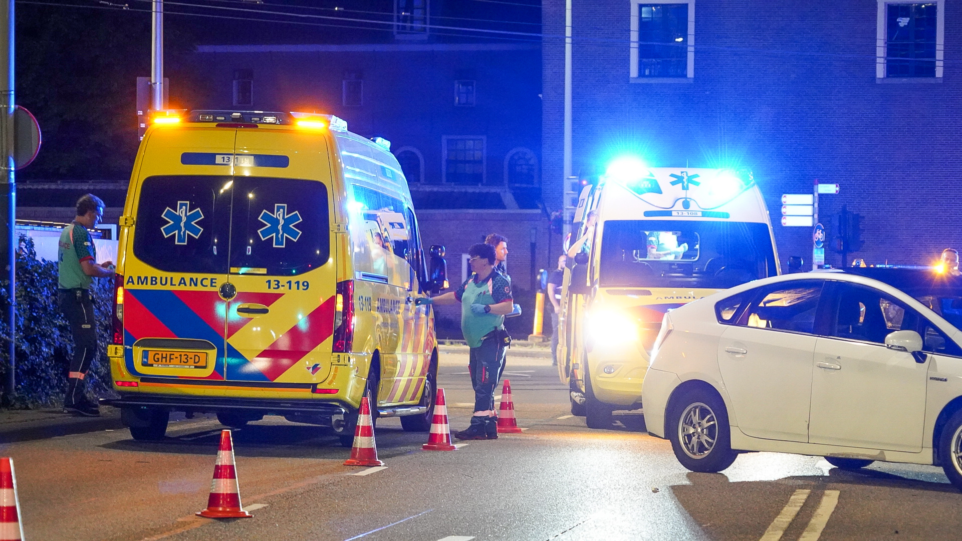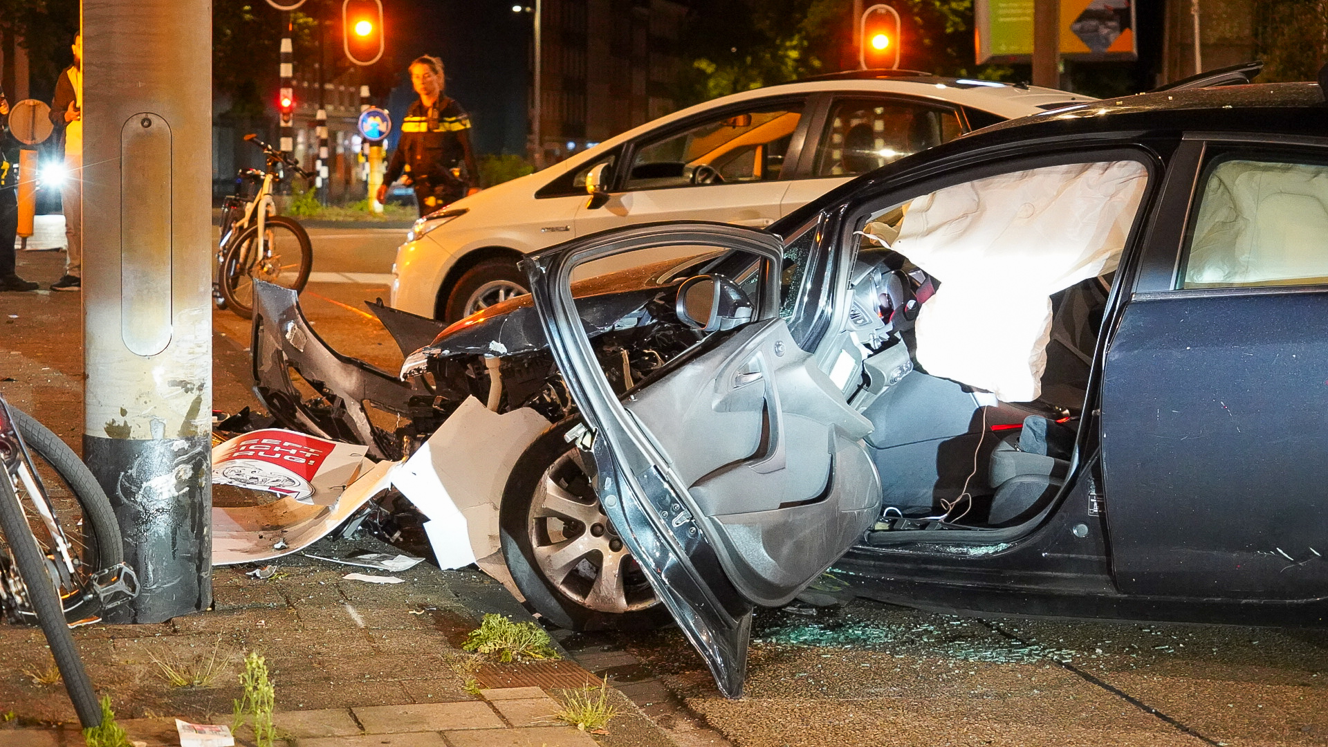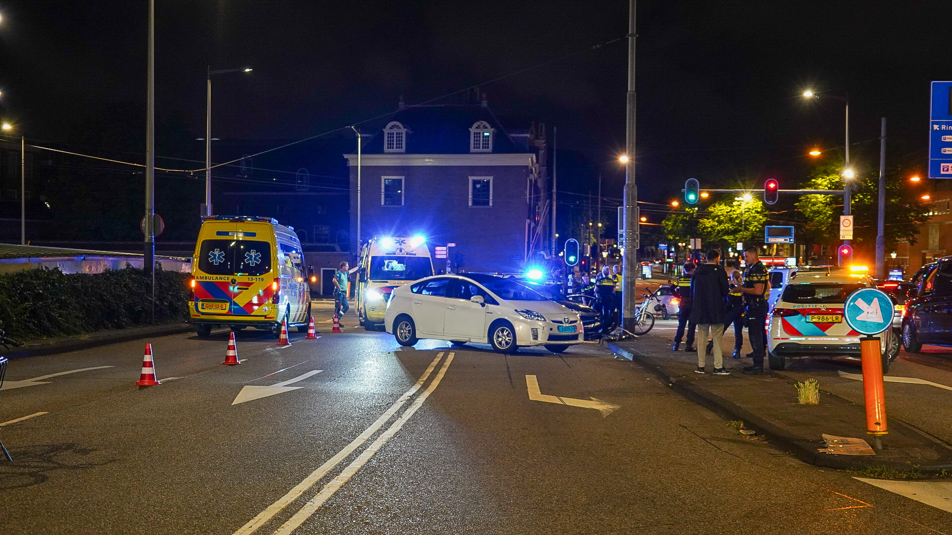 Een automobilist verloor door nog onbekende oorzaak de macht over het stuur en botste tegen een andere personenauto en een lantaarnpaal. Door het ongeval raakte de bestuurder van de zwarte auto gewond. Twee ambulances en een mobiel medisch team kwamen ter plaatse.