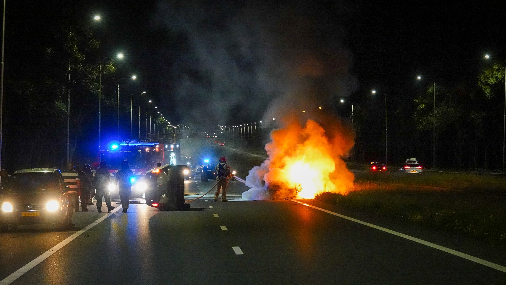 Een automobilist botste aan de rechterzijde tegen de vangrail en belandde op zijn kant. Een achteropkomende auto knalde erop en vloog direct in brand. Beide bestuurders wisten zelf uit hun voertuigen te komen, maar raakten gewond en zijn naar het ziekenhuis gebracht.