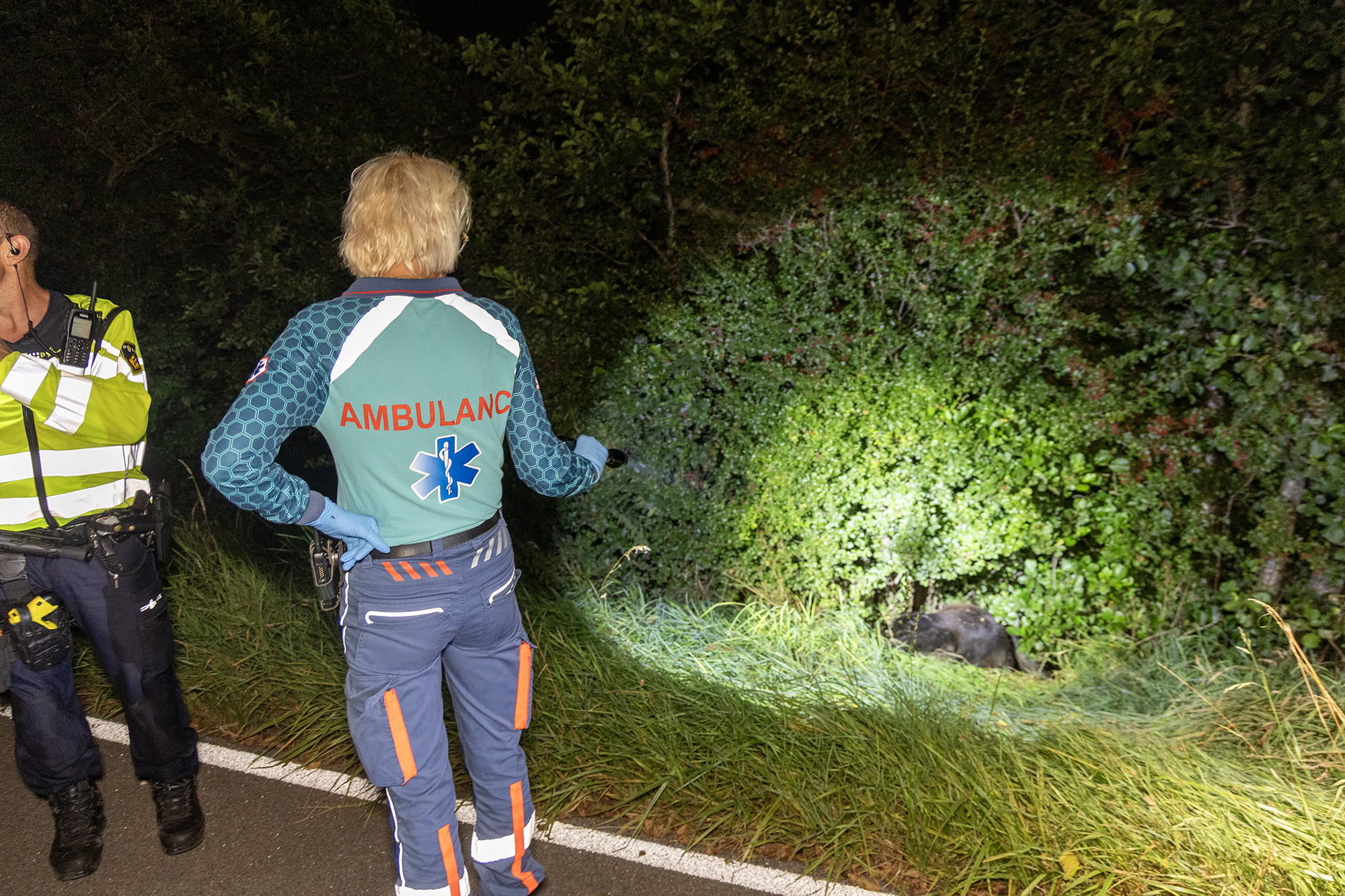De auto raakte zwaar beschadigd. De N246 werd volledig afgesloten voor het werk van hulpdiensten en een bergingsbedrijf. Hoe de dieren op de weg terechtkwamen, wordt onderzocht.